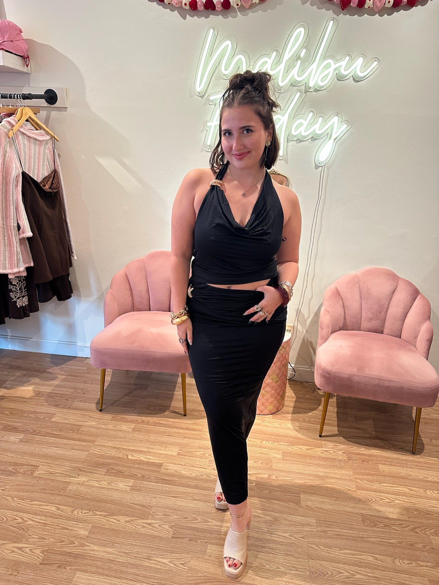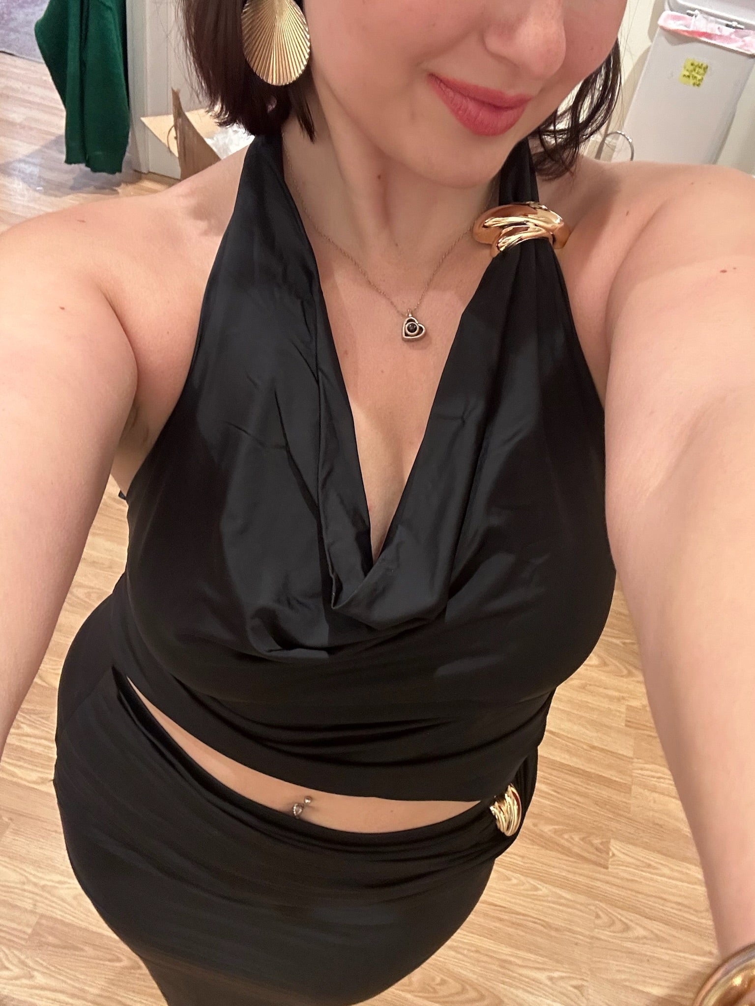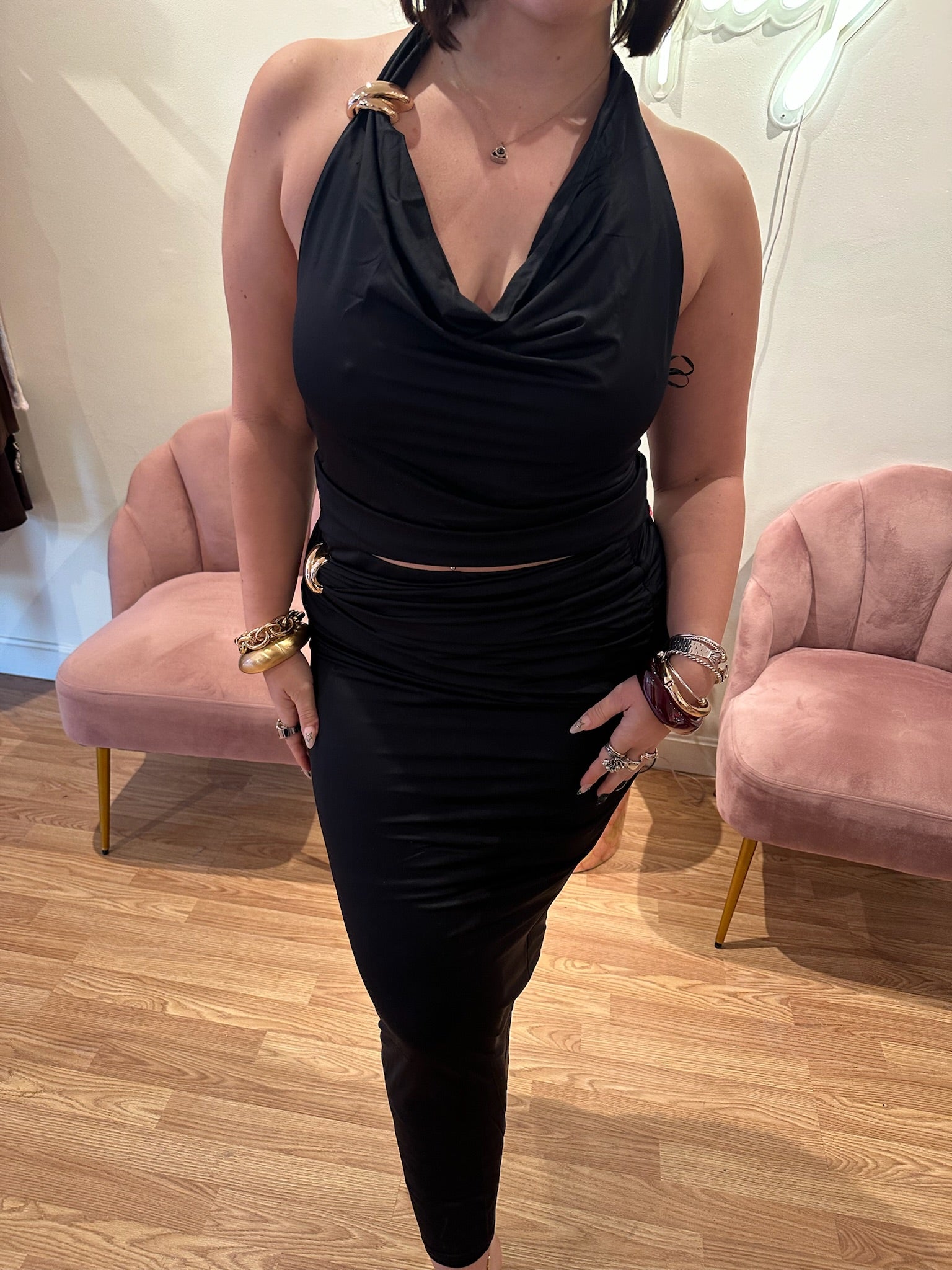 Sleek and versatile, this sleeveless cowl neck tank features elegant gold trim detailing that elevates any outfit. Dress it up with our "Seen the World" skirt for a coordinated look, or keep it casual paired with your favorite denim. The draped neckline adds sophistication while the lightweight design keeps you comfortable from day to night.