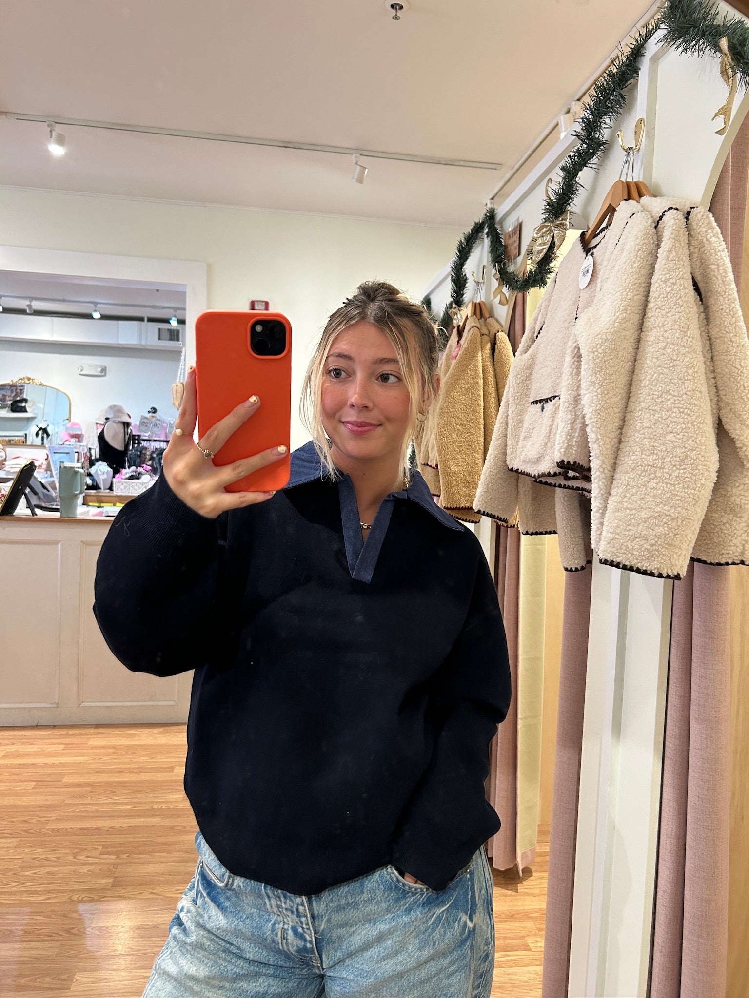 The Andreas Sweater brings effortless cool to your everyday rotation. Crafted in rich navy with an unexpected denim collar that adds texture and visual interest, this piece walks the line between classic and contemporary. Layer it over your favorite tee or wear it solo for a relaxed, put-together vibe. Perfect for those who appreciate thoughtful design details that make a subtle statement.
