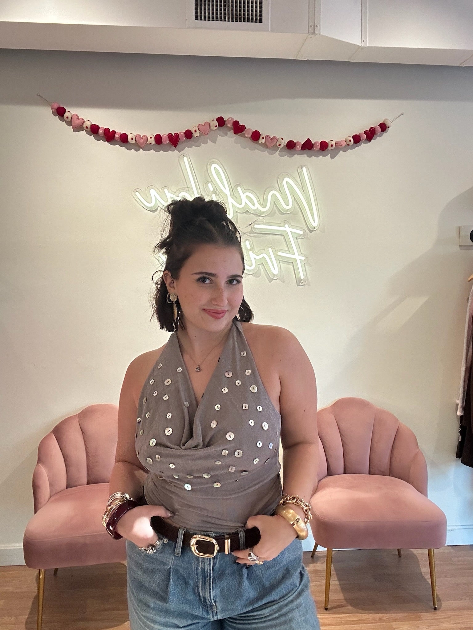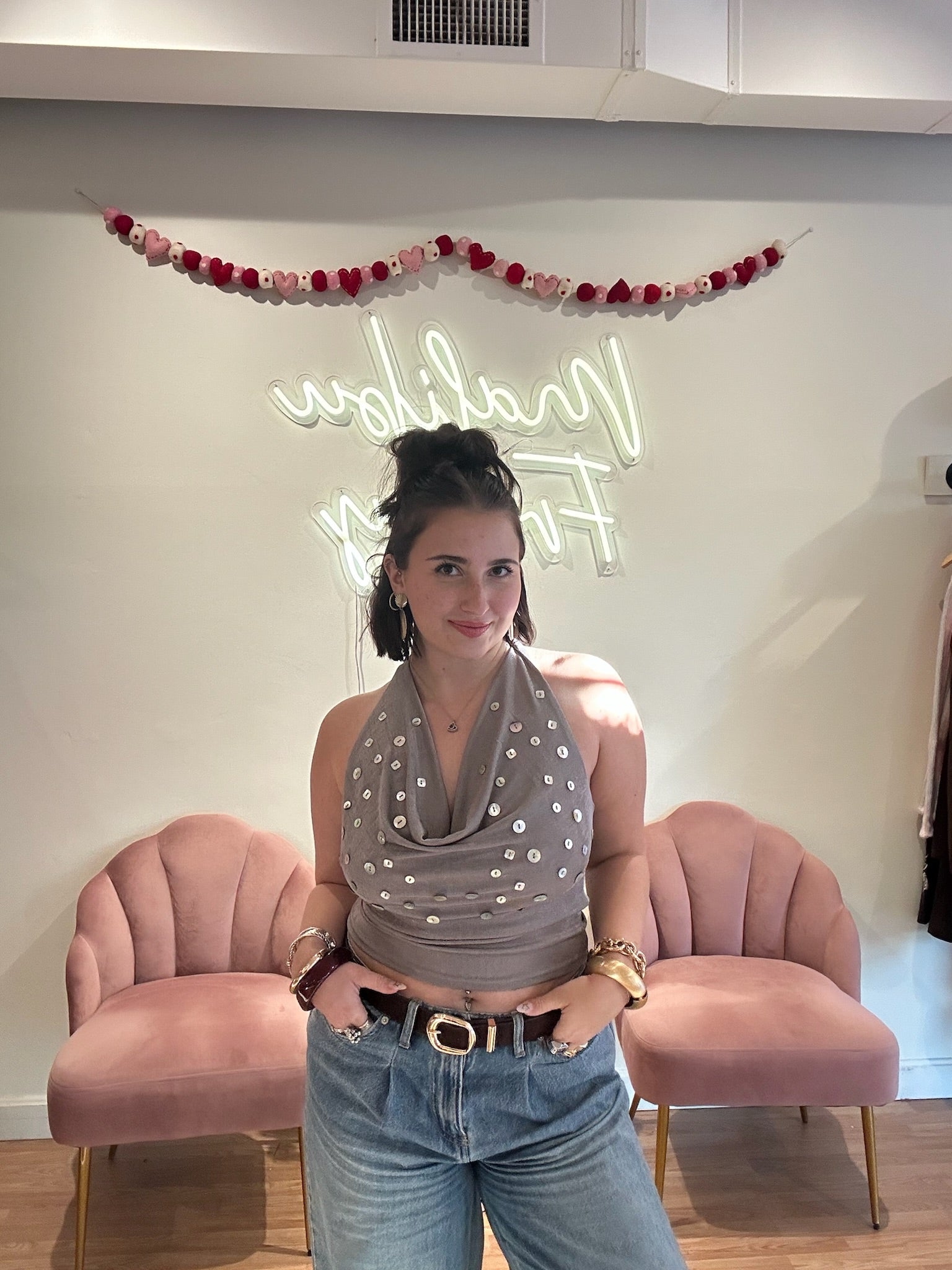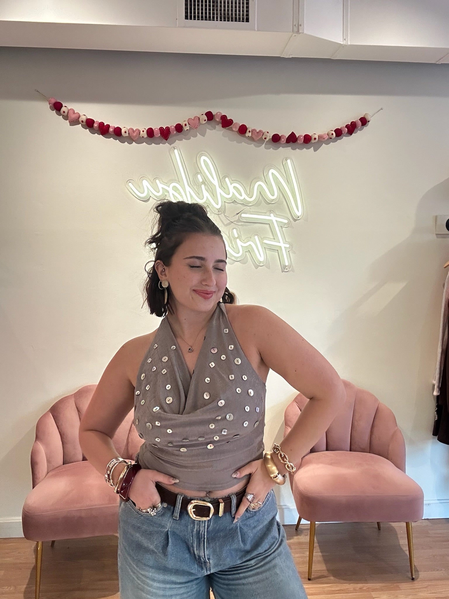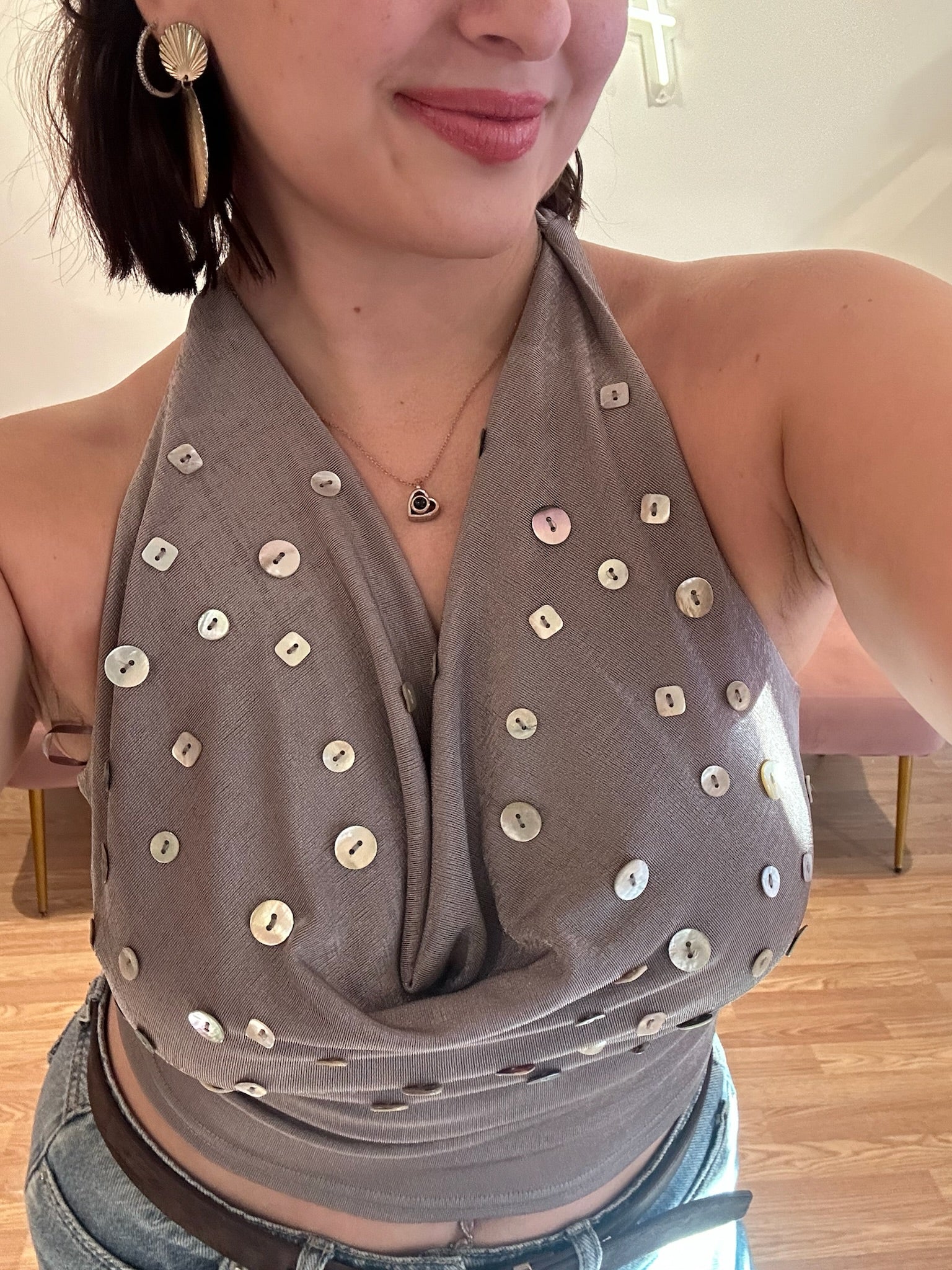 The Barry Button Tank is a chic, playful stunner designed to amp up your style game. This flirty top features a breezy cowl neck, a sleek halter silhouette, and eye-catching shell buttons throughout for a pop of detail. With an elastic back for a comfy, customized fit, it's the perfect piece for days and nights filled with confidence and fun. Whether you're heading out for brunch or a night on the town, this versatile tank delivers effortless style with just the right amount of personality.
