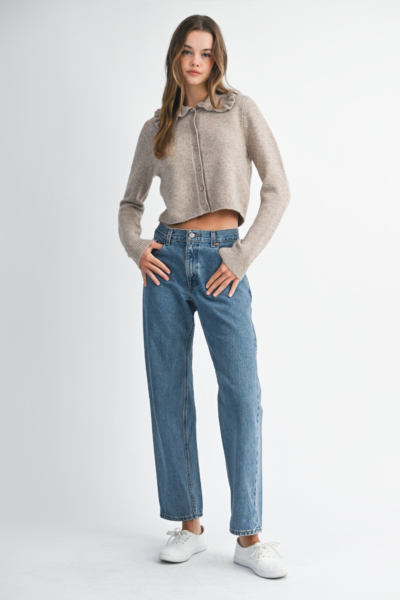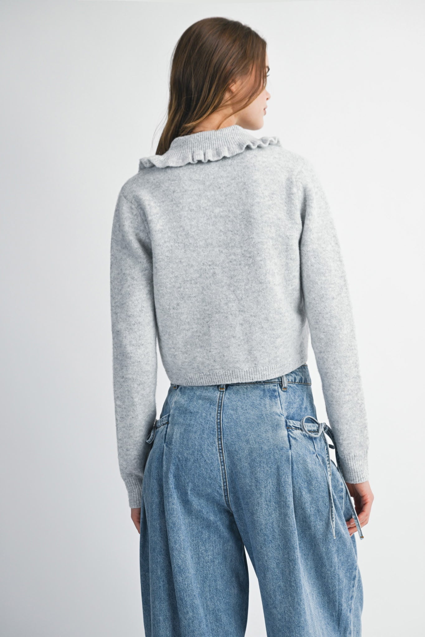 Layer up in style with the Cameron Collared Sweater, your new go-to for effortless charm. This cozy knit features a playful ruffled collar that adds personality to any outfit, plus convenient button-up styling for easy layering. Perfect for casual days or dressed-up occasions, it's available in versatile heather grey and warm mocha. Comfort meets character in one irresistible piece.