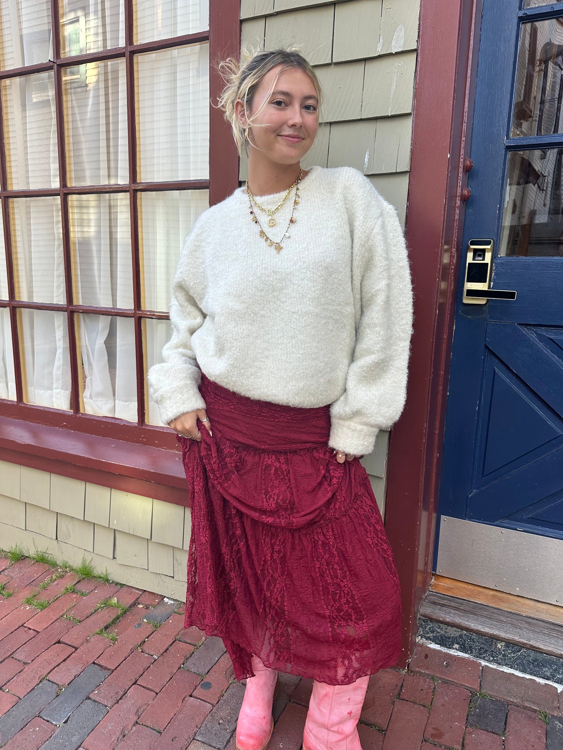 Twirl into fun with the Cherry Pie Skirt in a rich burgundy shade! This mermaid maxi features playful tiered layers that add a flirty bounce to every step. Perfect for sunny days or evening outings, its flowy silhouette brings a whimsical charm to your wardrobe. Embrace effortless style with a skirt that moves as freely as you do!