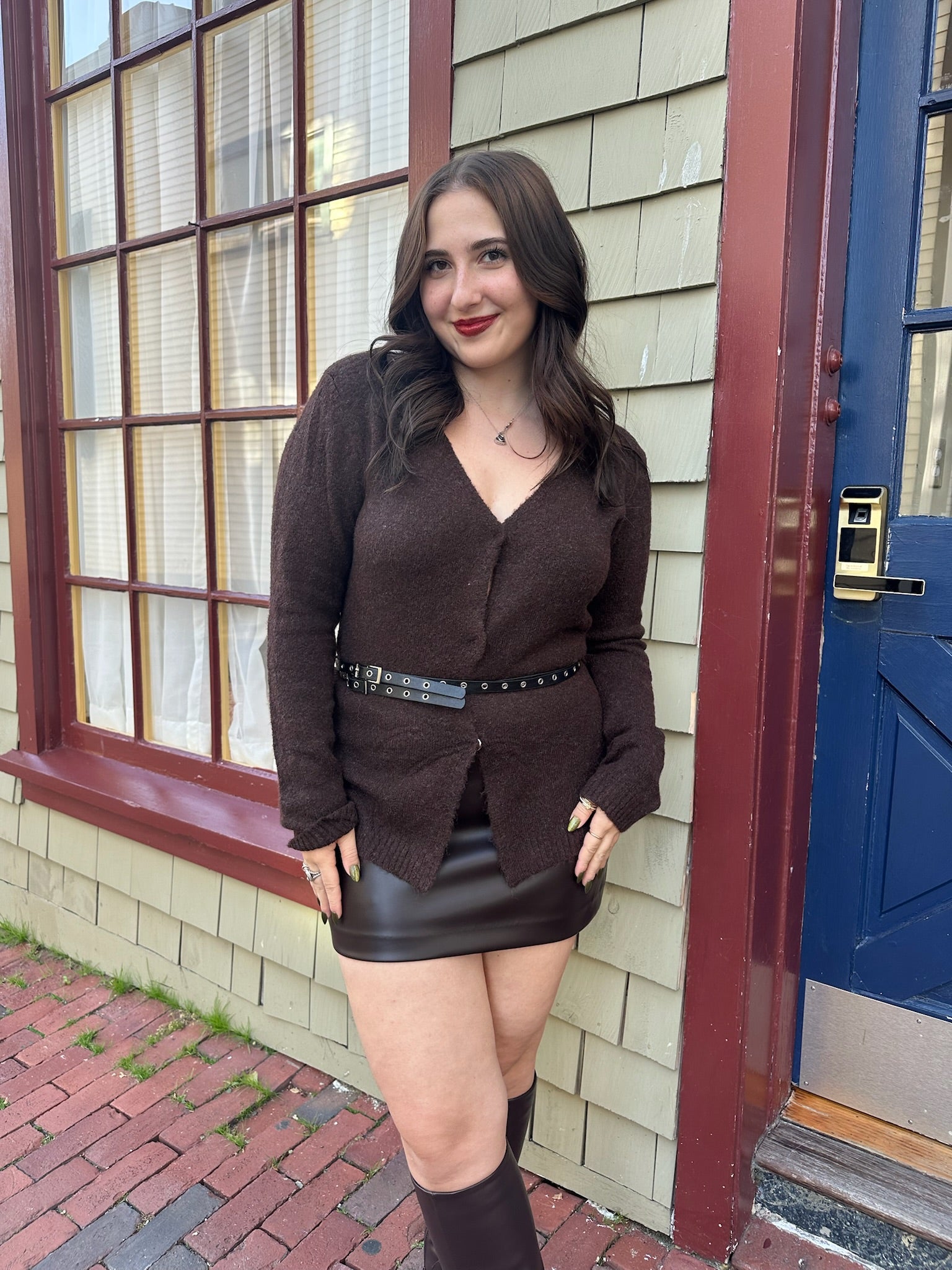 Cozy up in the Coffee Date Sweater, a rich chocolate brown knit that wraps you in warmth and style. The attached belt lets you cinch your waist for a flattering fit, perfect for sipping lattes or lounging around. It’s your new go-to for playful comfort with a touch of chic.