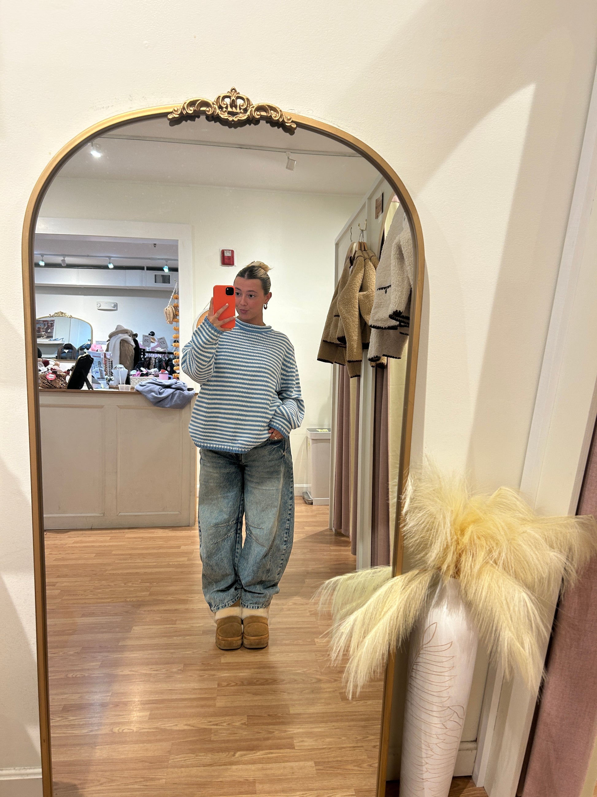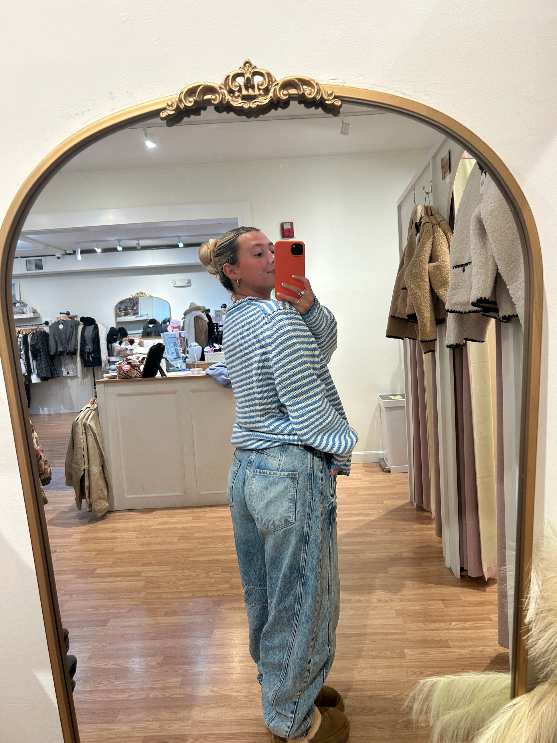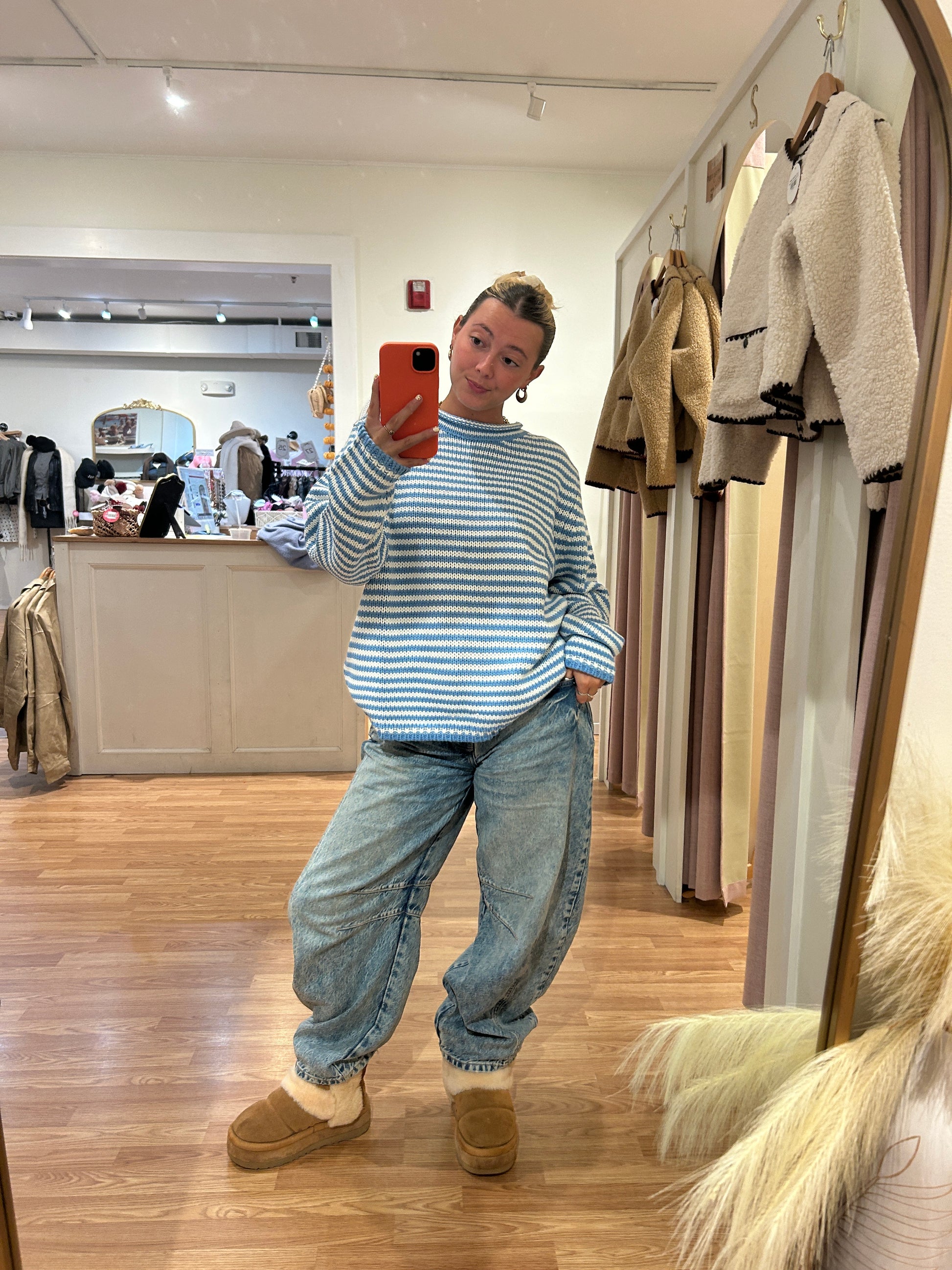 Striped knits are having a moment, and this sweater proves why. The classic blue and white stripes create an effortlessly cool vibe, while the rolled neckline adds a touch of laid-back sophistication. Perfect for layering over basics or pairing with your favorite denim, this piece brings that breezy, coastal energy to any outfit. A wardrobe essential that works as hard as you do.
