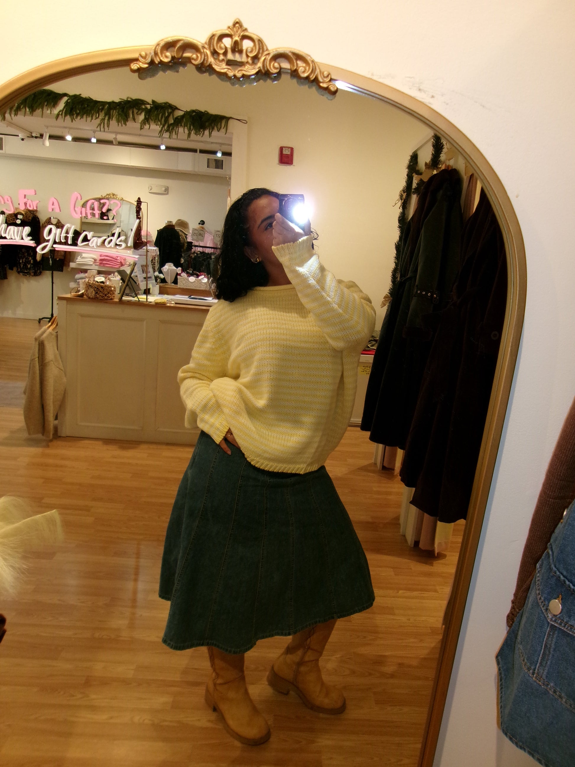 Striped knits are having a moment, and this sweater proves why. The classic butter lemon and white stripes create an effortlessly cool vibe, while the rolled neckline adds a touch of laid-back sophistication. Perfect for layering over basics or pairing with your favorite denim, this piece brings that breezy, coastal energy to any outfit. A wardrobe essential that works as hard as you do.