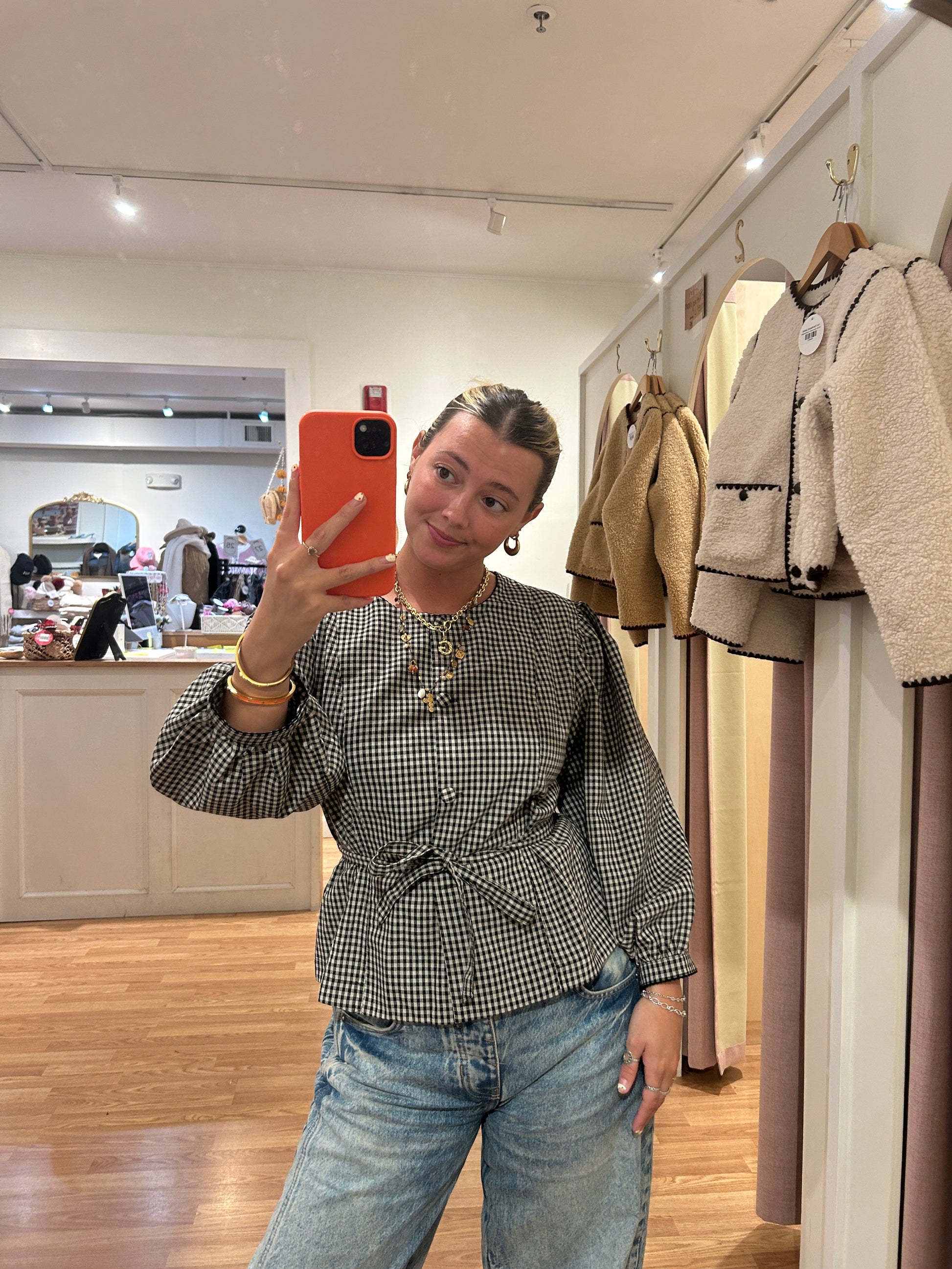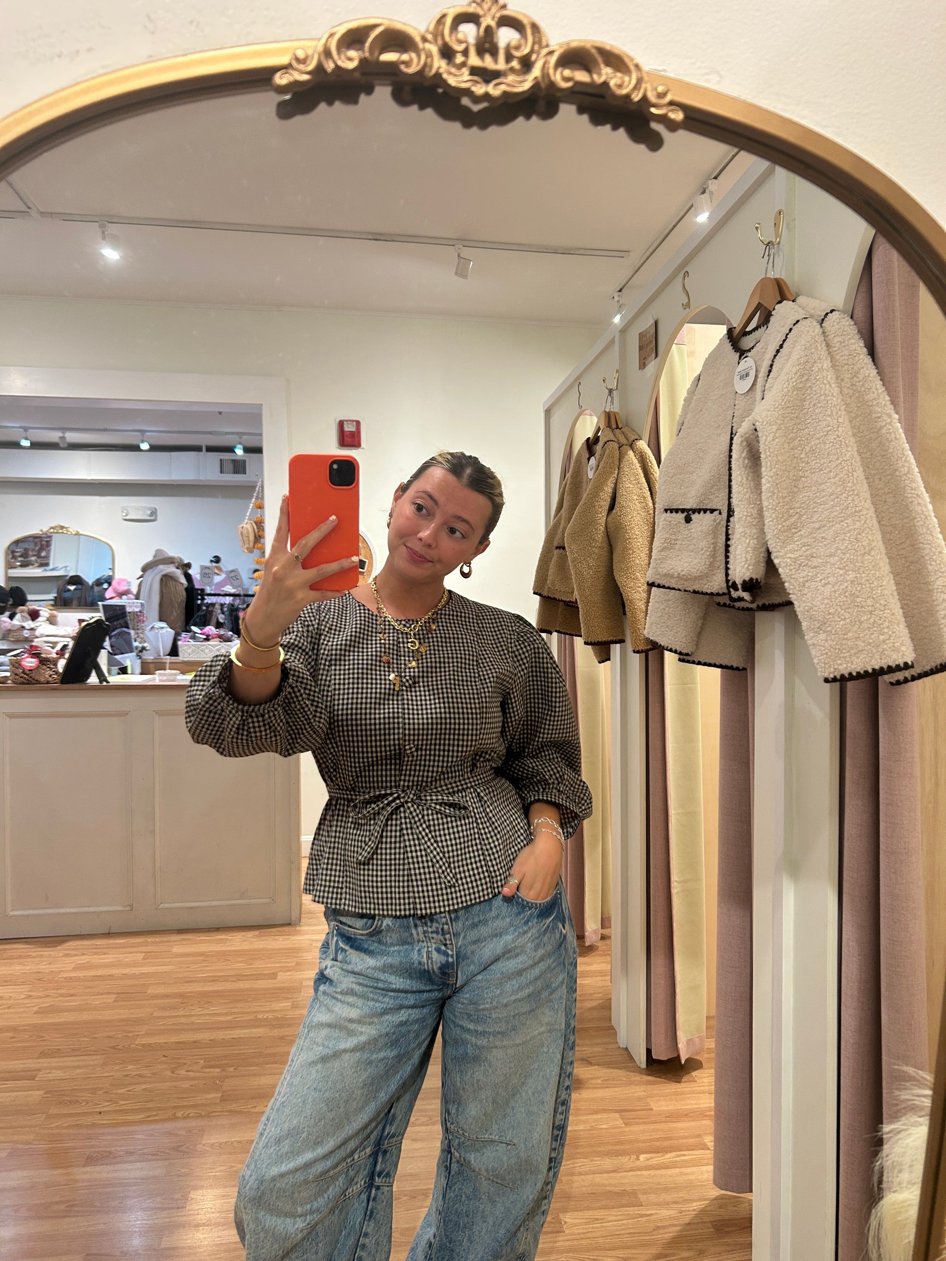 Effortlessly chic meets playful charm with this gingham button-down top. The cinched waist creates a flattering silhouette that works for brunch dates or weekend adventures. Classic gingham pattern pairs with modern tailoring for a look that's both timeless and fun. Easy to dress up or down, this versatile piece becomes an instant wardrobe staple you'll reach for again and again.