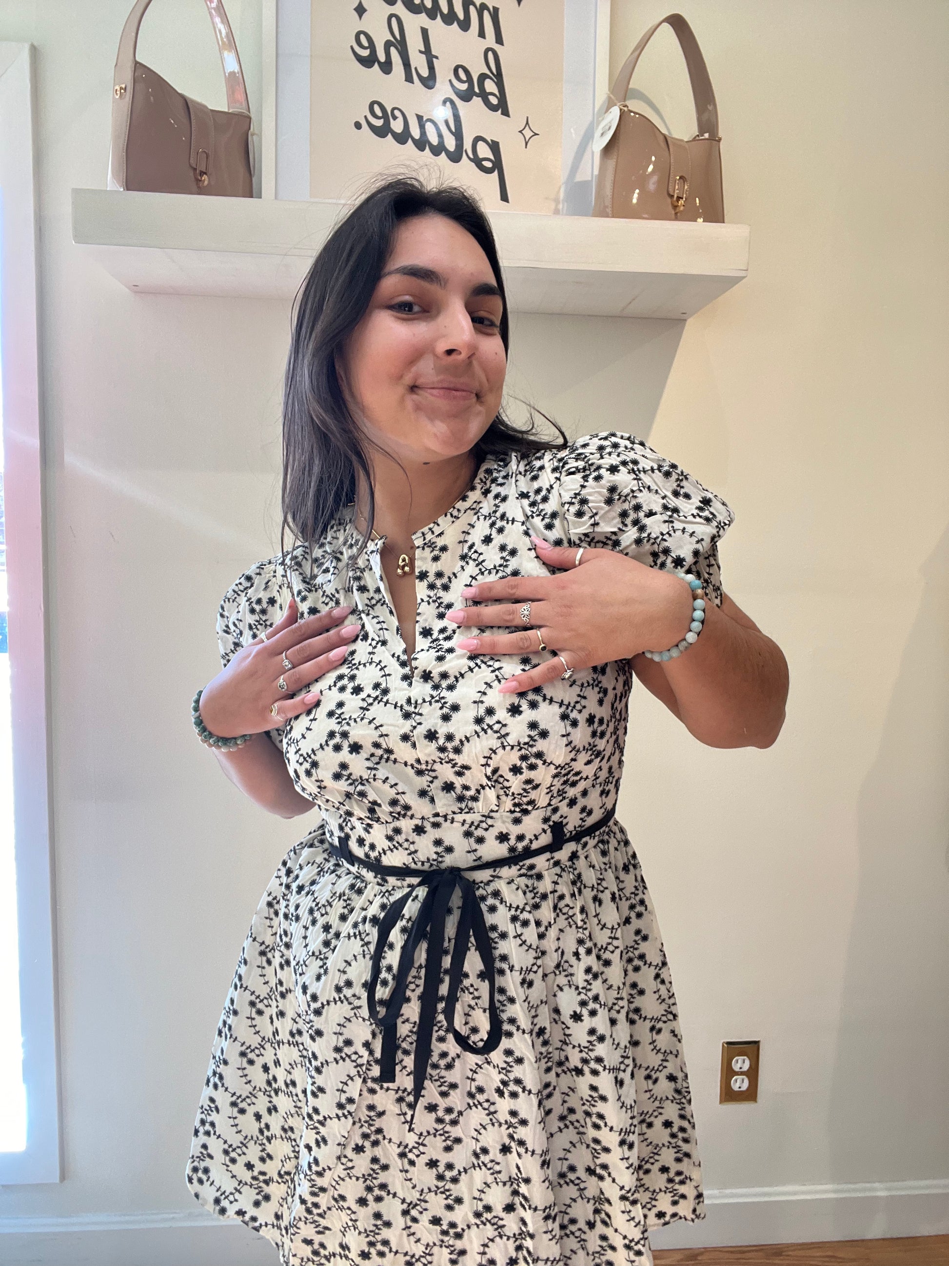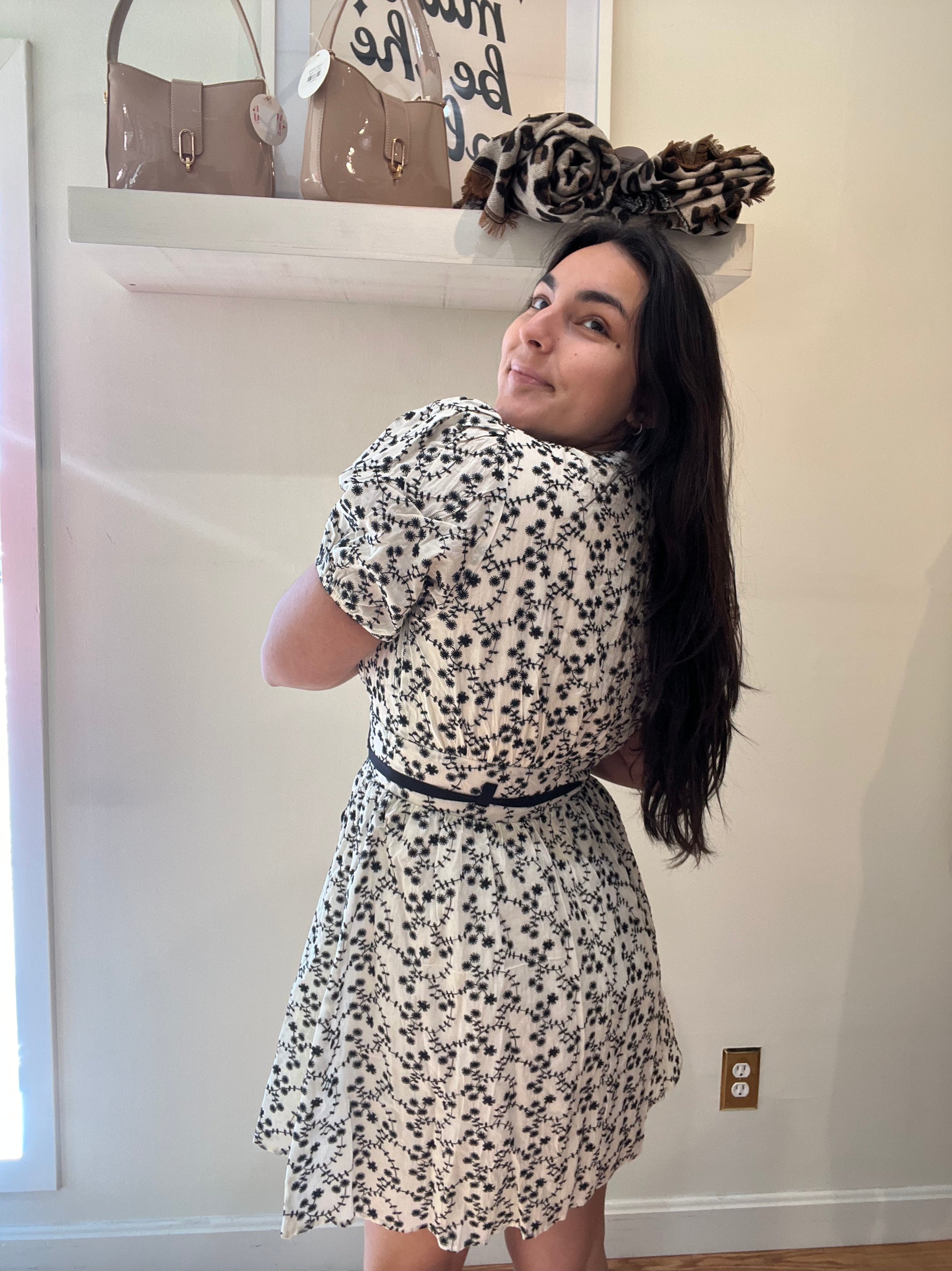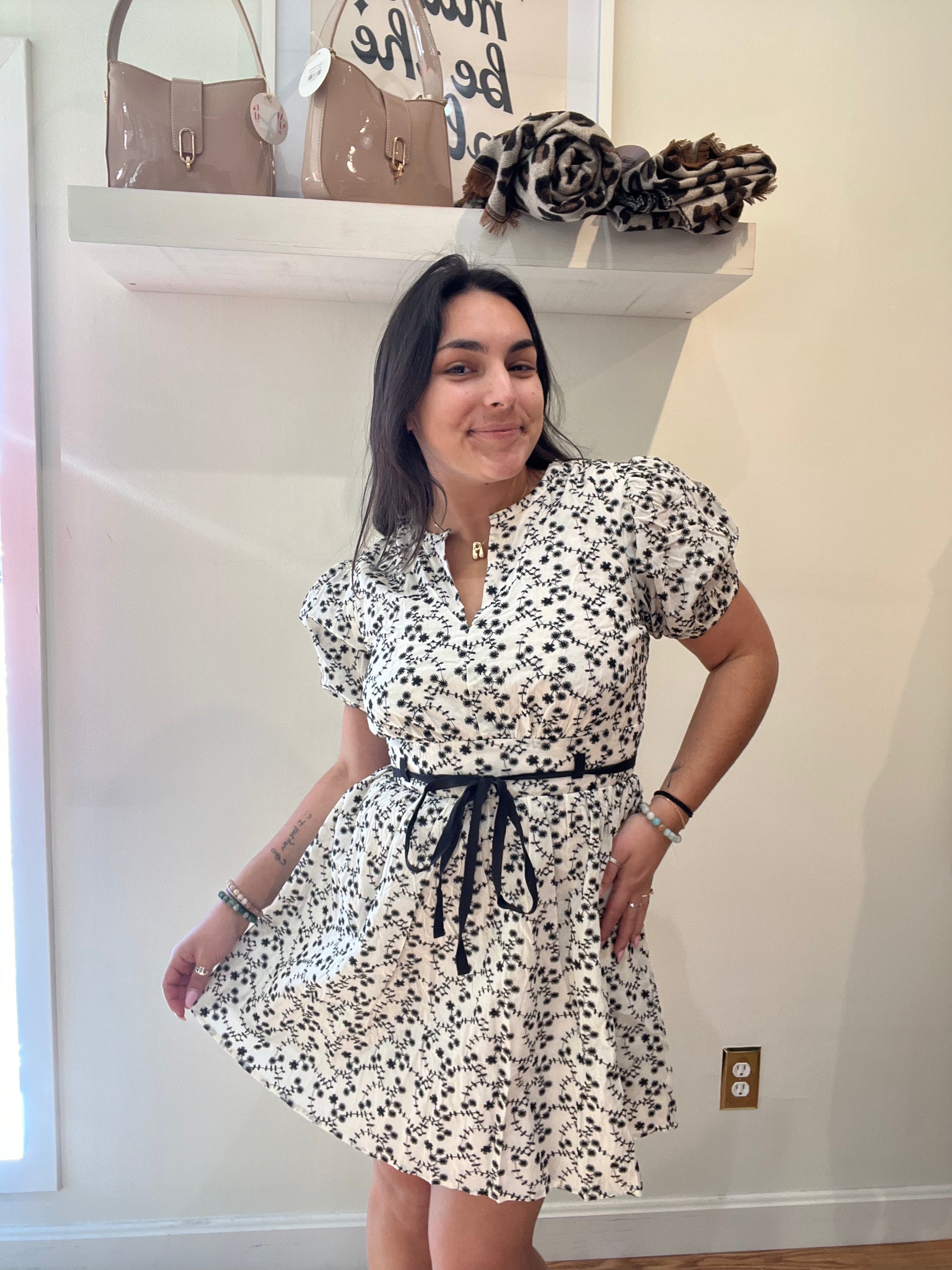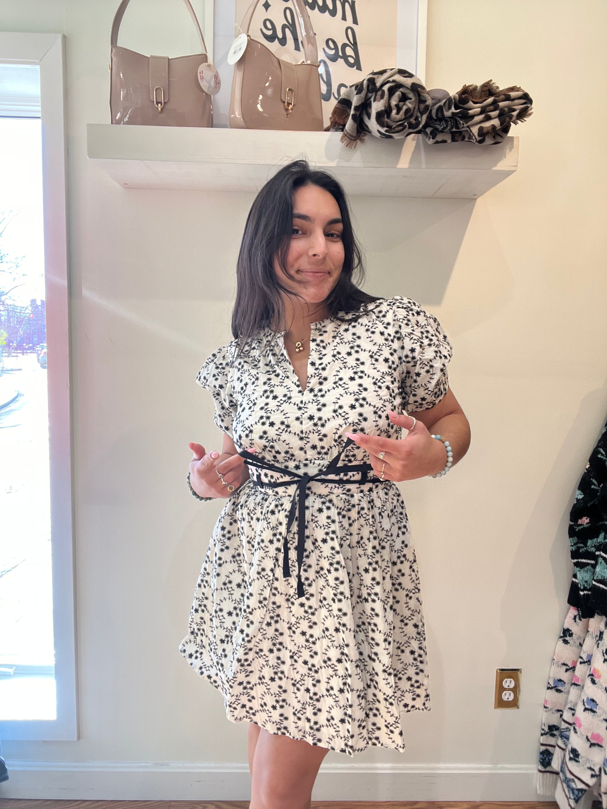 Be the talk of the town with our Forbidden Love Mini dress. Designed with playful puff sleeves and intricate embroidered details, this dress features a flattering V-neck and an adjustable tie belt for the perfect fit. The black and white florals add a touch of whimsy to this feminine and fun piece.