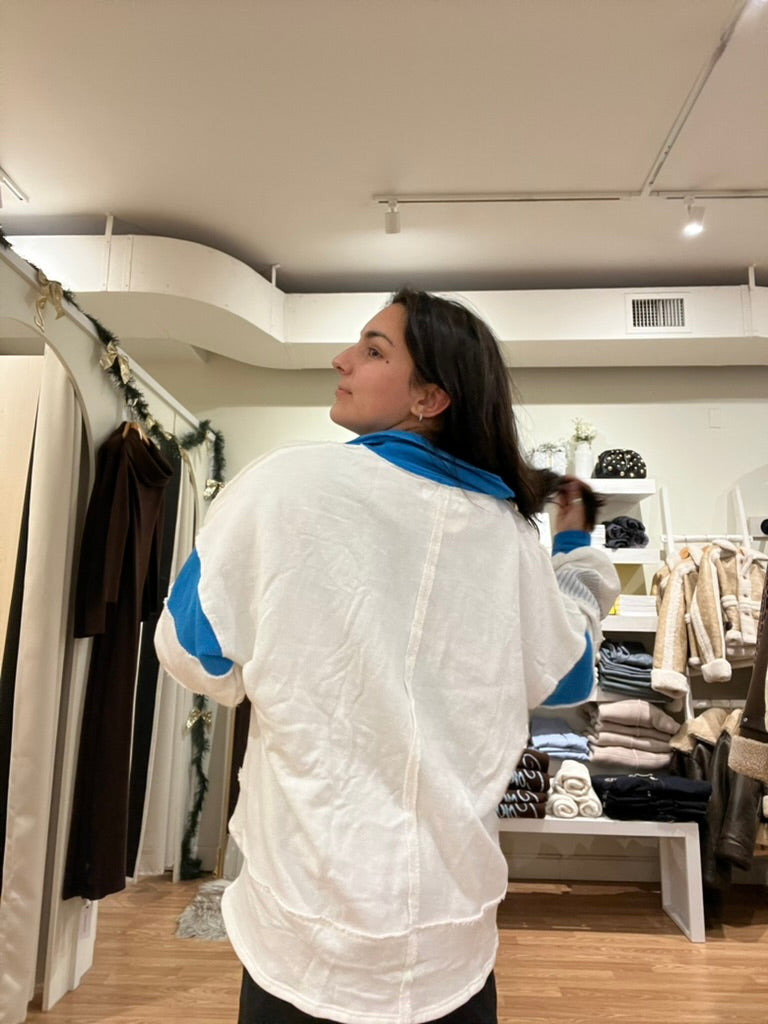 Fun and flirty, this pullover is an eye-catching combo of ivory and blue colorblock that looks great no matter how you style it! Stay cozy in this comfy piece that is sure to draw the right kind of attention!