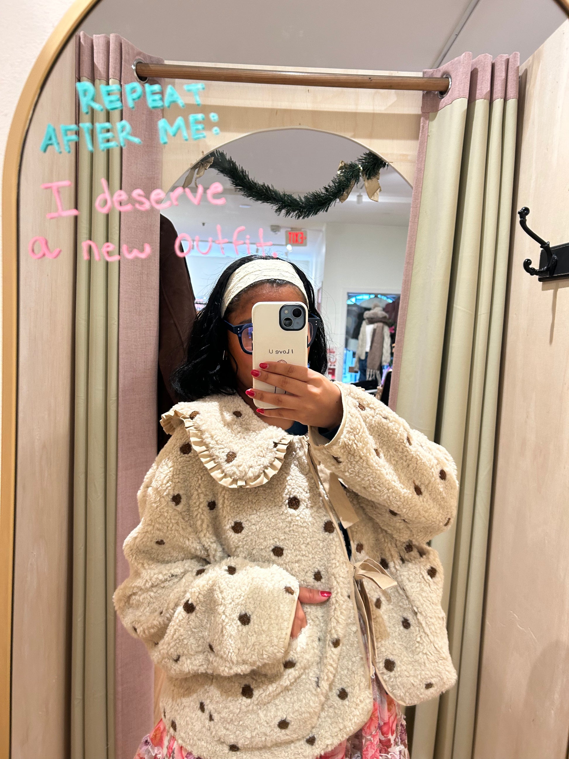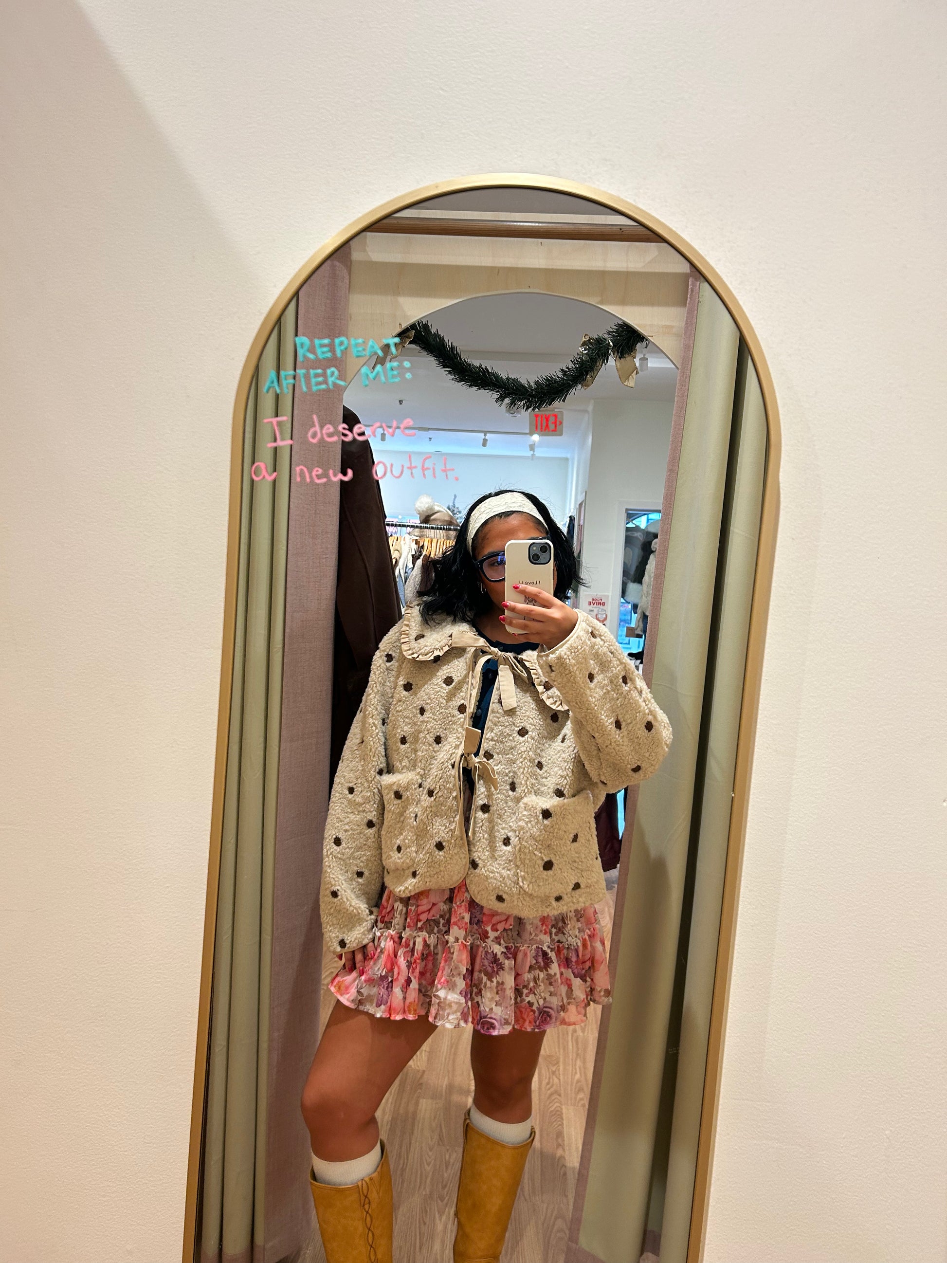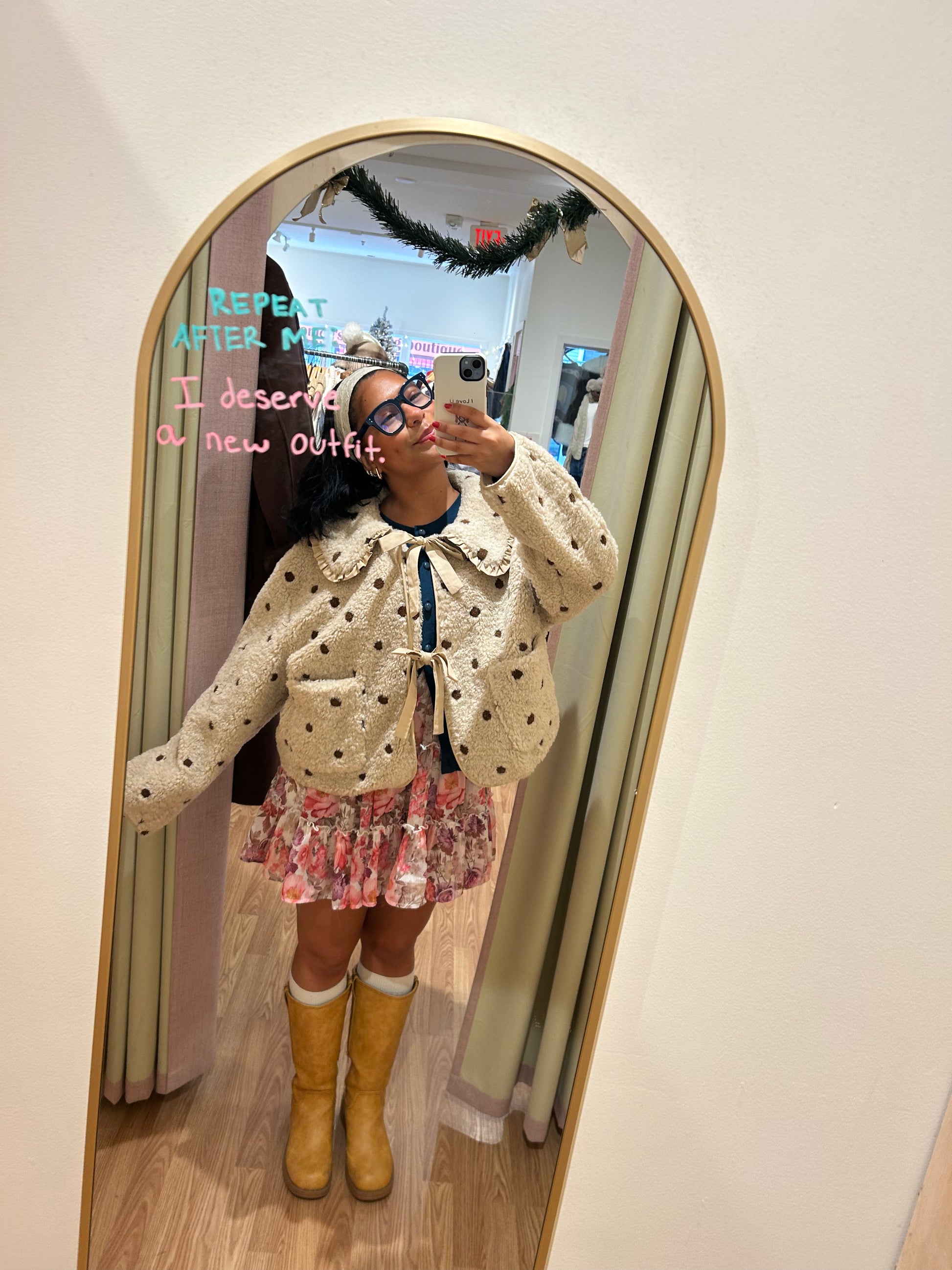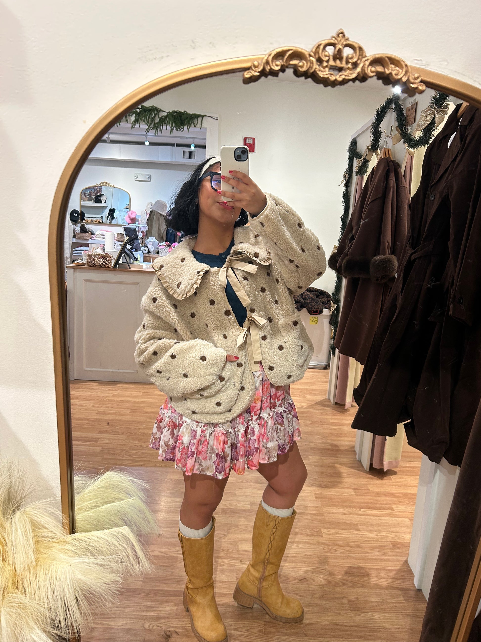 Cozy up in the Marley Jacket, a charming fluffy fleece adorned with playful brown polka dots. Its soft texture and delicate bow ties at the front add a sweet, whimsical touch, making it perfect for chilly days when you want to stay warm and adorable.