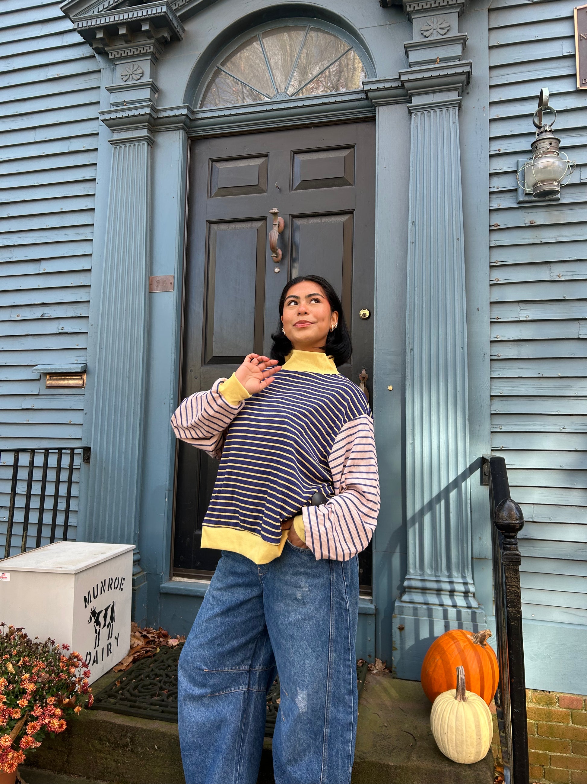 Cozy up in the Stevie Pullover, where autumn vibes meet laid-back style. This mock neck pullover features bold stripes in rich fall hues—think burnt orange, deep burgundy, and warm gold—that layer beautifully with your seasonal wardrobe. The relaxed fit and soft fabric make it perfect for crisp mornings, weekend hangouts, or those moments when you want to feel effortlessly put-together. Stripe it up and embrace the season.