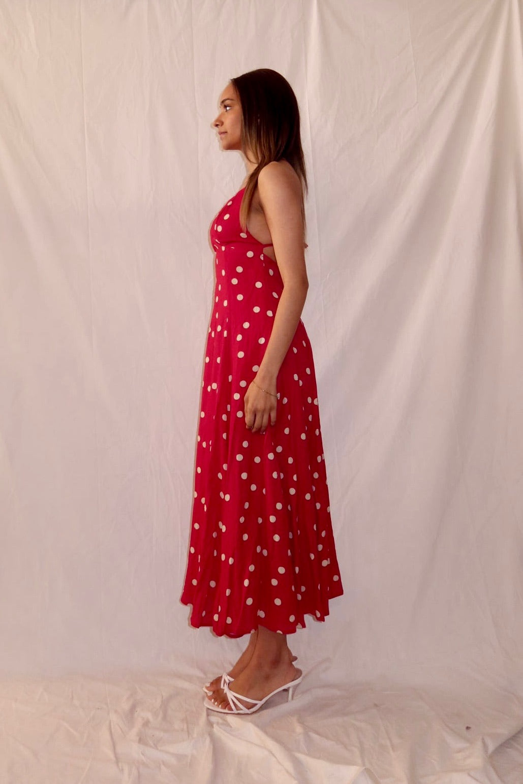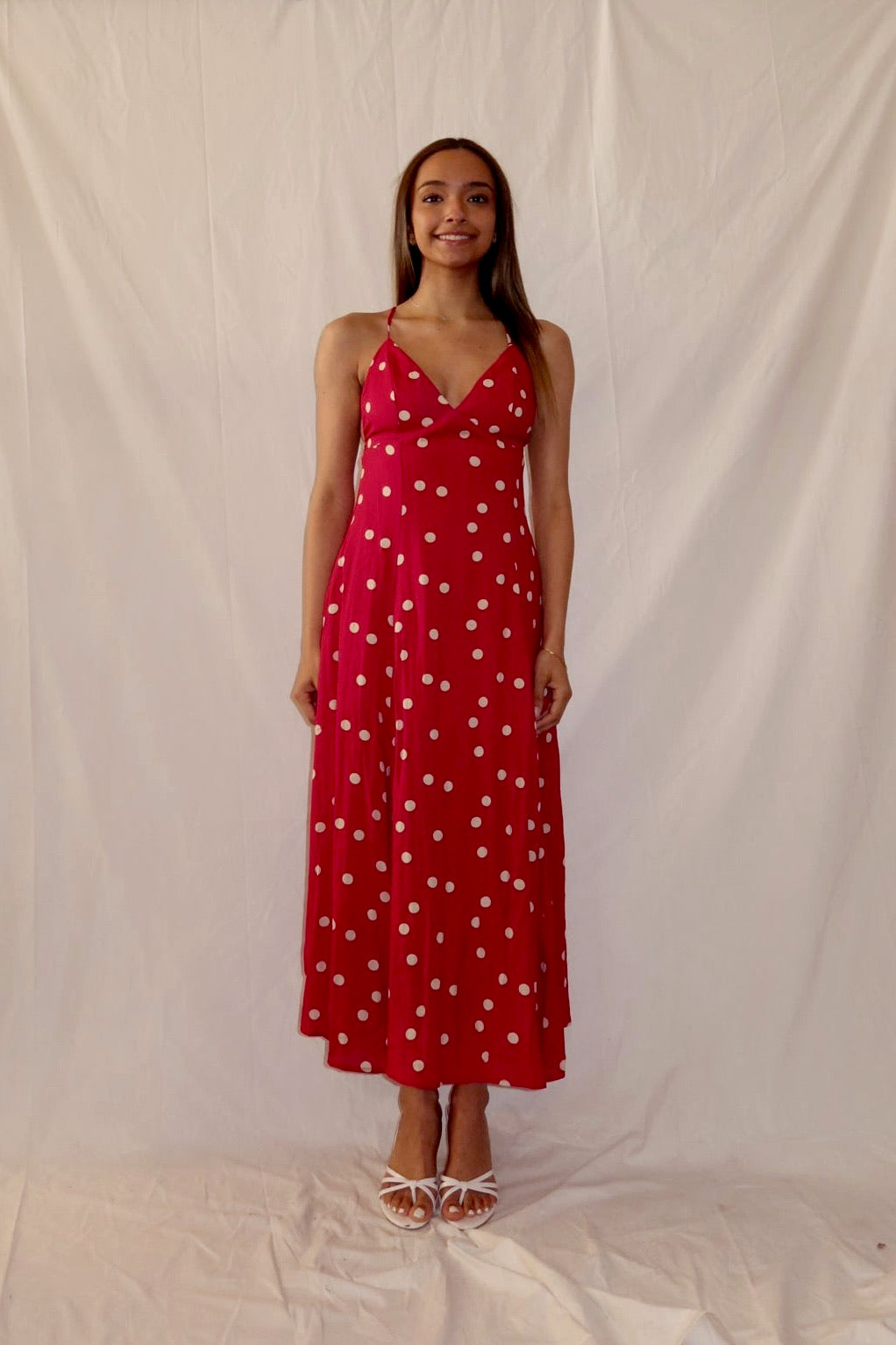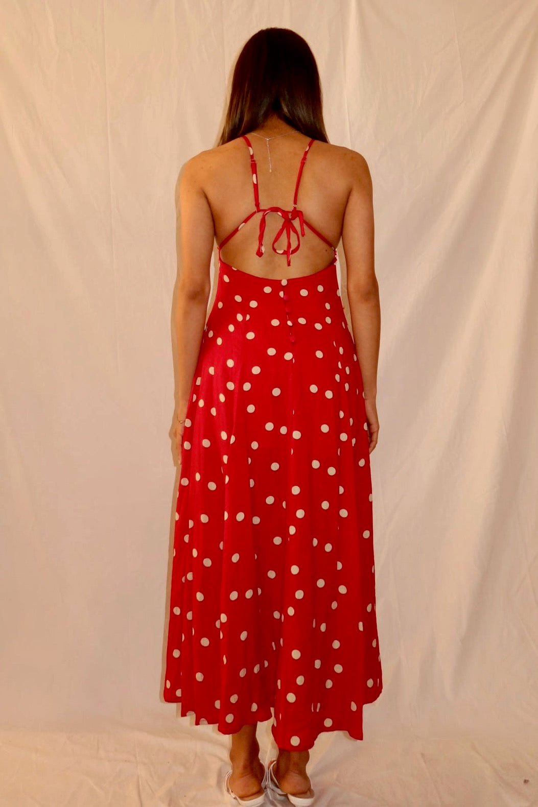 Elevate your wardrobe with this stunning polka dot maxi dress featuring a flattering fit-and-flare silhouette. The plunging neckline and open back create an effortlessly chic look, while princess seams provide a refined shape. Practical side pockets keep essentials close, and adjustable straps with a back tie closure ensure the perfect fit. Low scoop back detailing with button closures at the waist adds visual interest, while the fully lined construction offers comfort and coverage all day long.