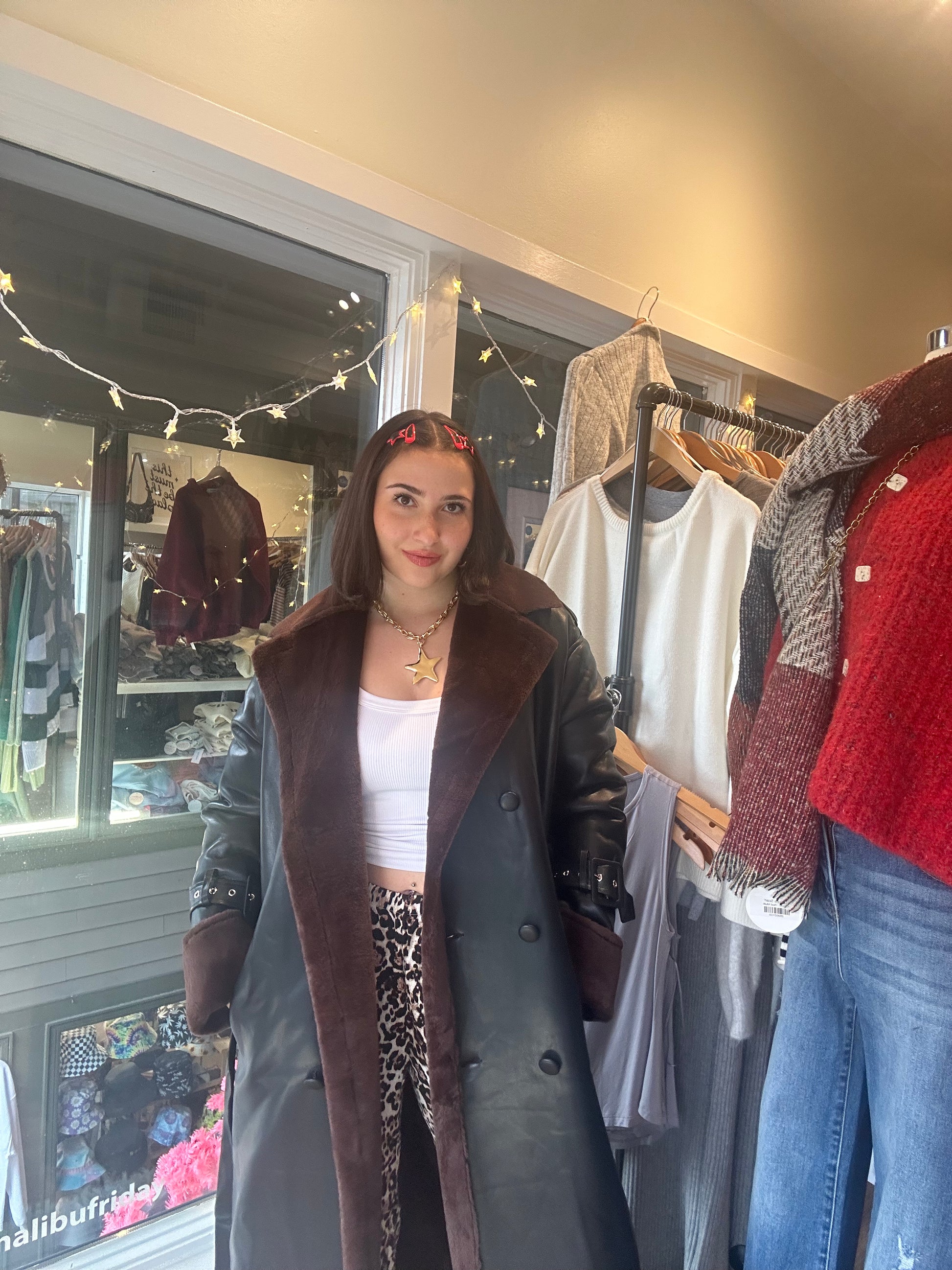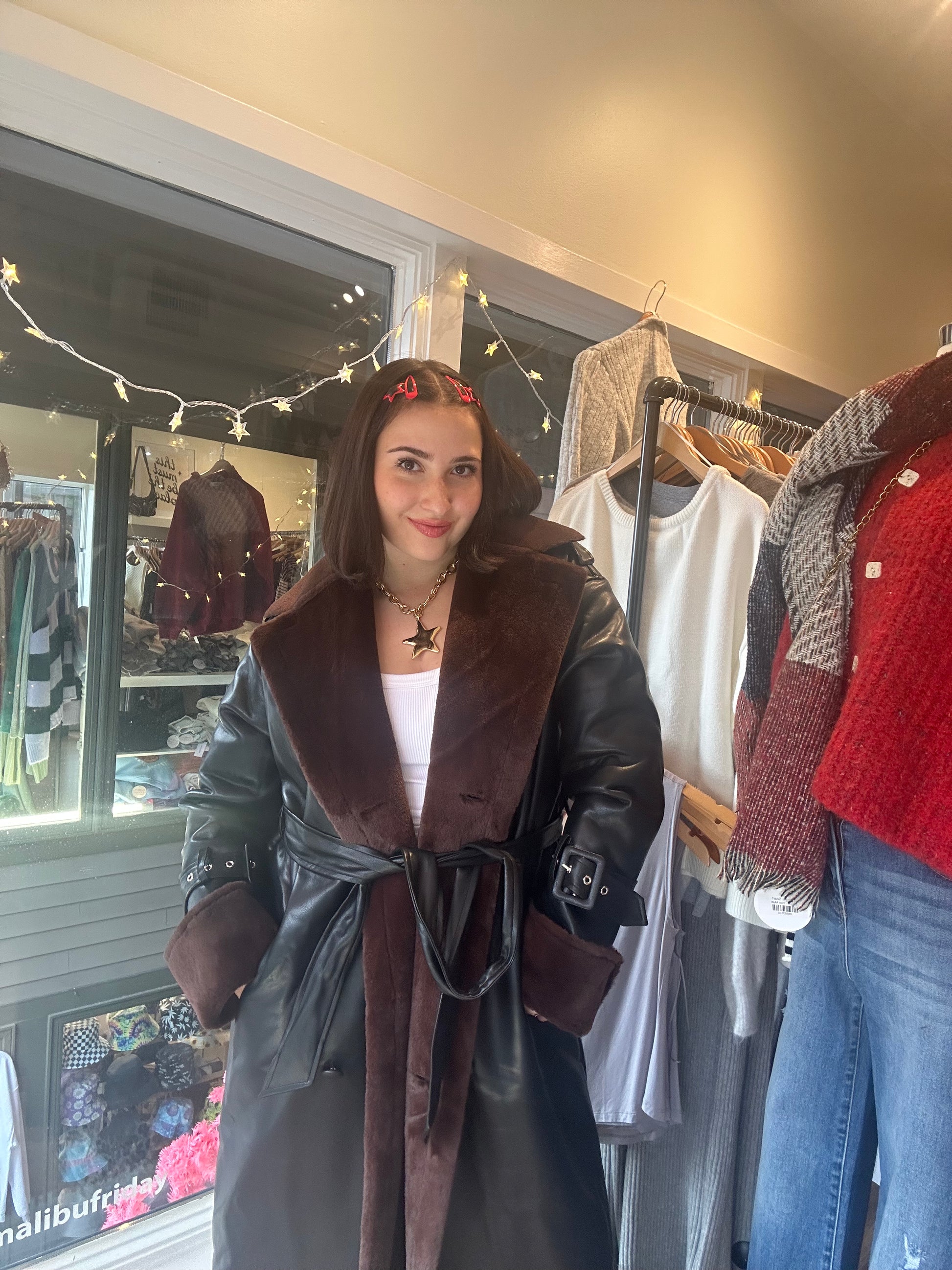 Make a statement without saying a word in this black leather trench coat, complete with a decadent chocolate brown fur lining that whispers luxury. Whether you're channeling old-school Hollywood or just want to feel like a style icon, this jacket delivers serious sophistication with a wink. The crisp leather exterior keeps things polished while that plush fur interior adds an indulgent surprise—because who says practical can't be playful? Your new favorite layering piece awaits.