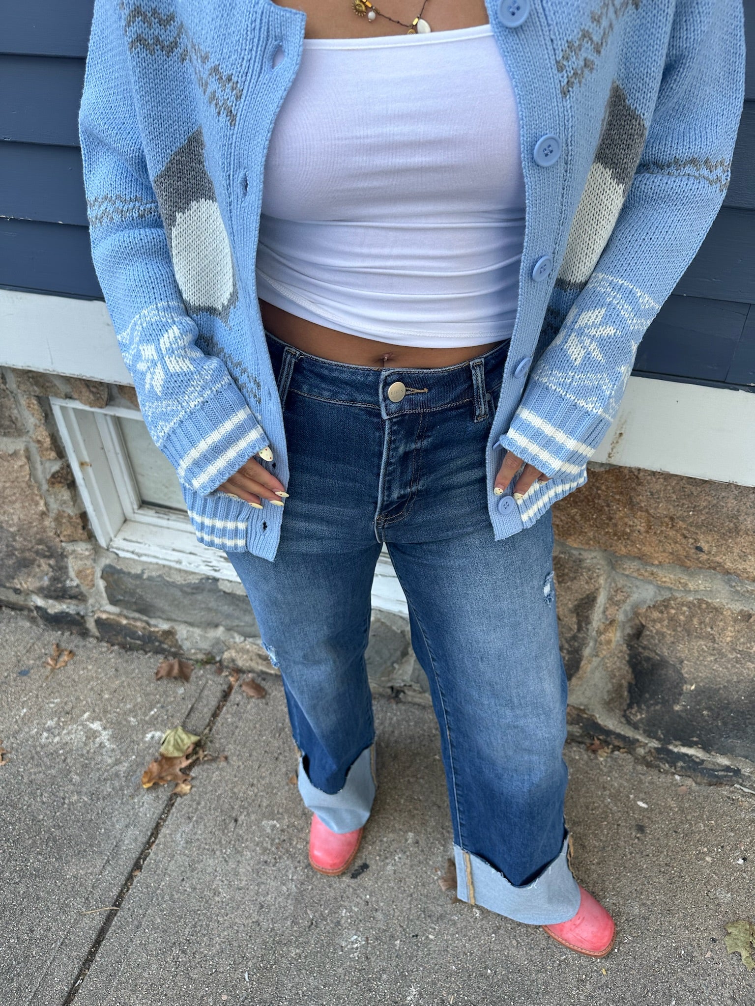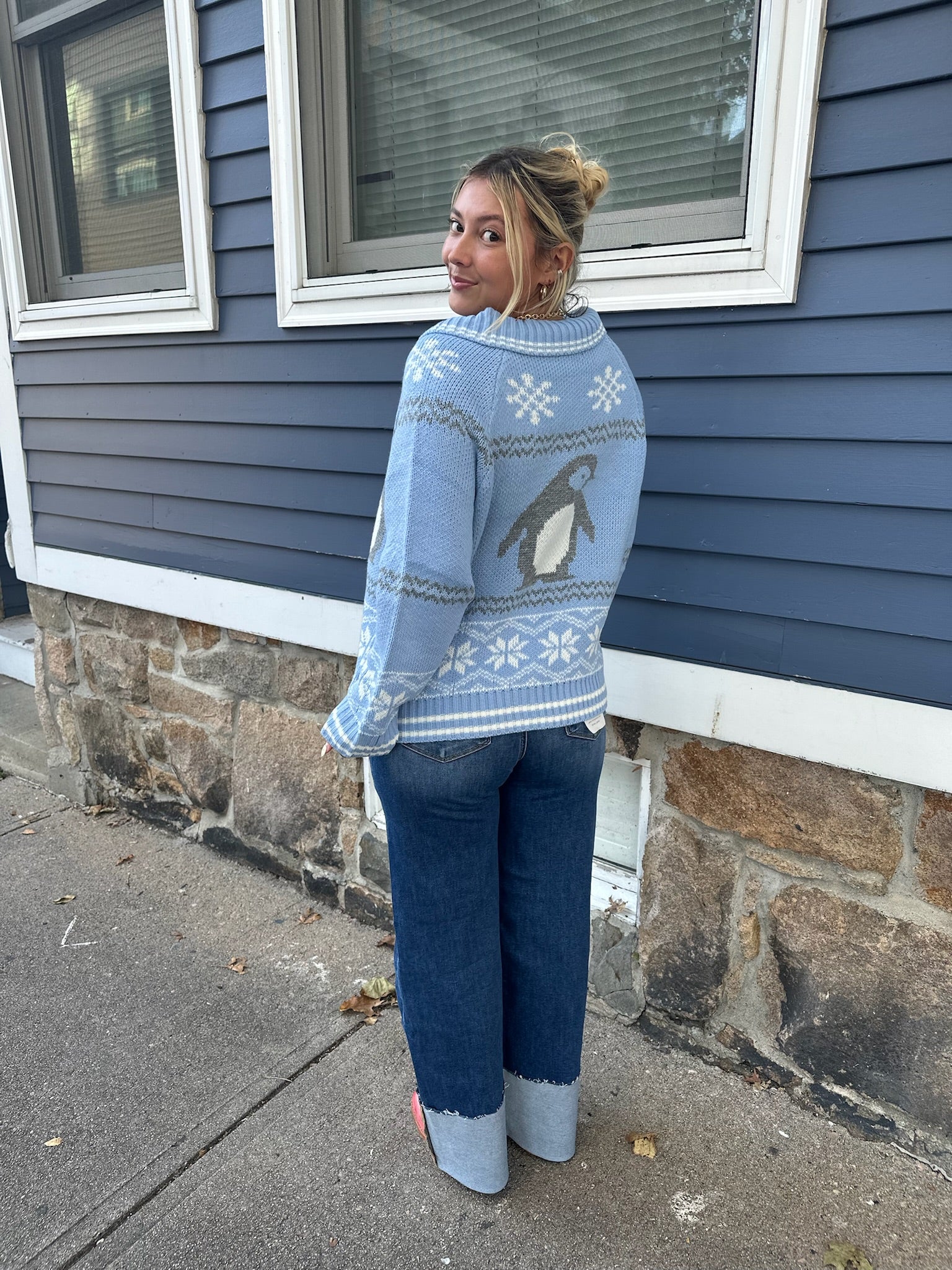 Stay cozy and charming with this blue button-up cardigan featuring a delightful penguin and snowflake design. Perfect for adding a touch of winter whimsy to any outfit, its soft fabric keeps you warm while the playful pattern brightens your day. Ideal for casual outings or cozy nights in, this cardigan brings fun and comfort together effortlessly.