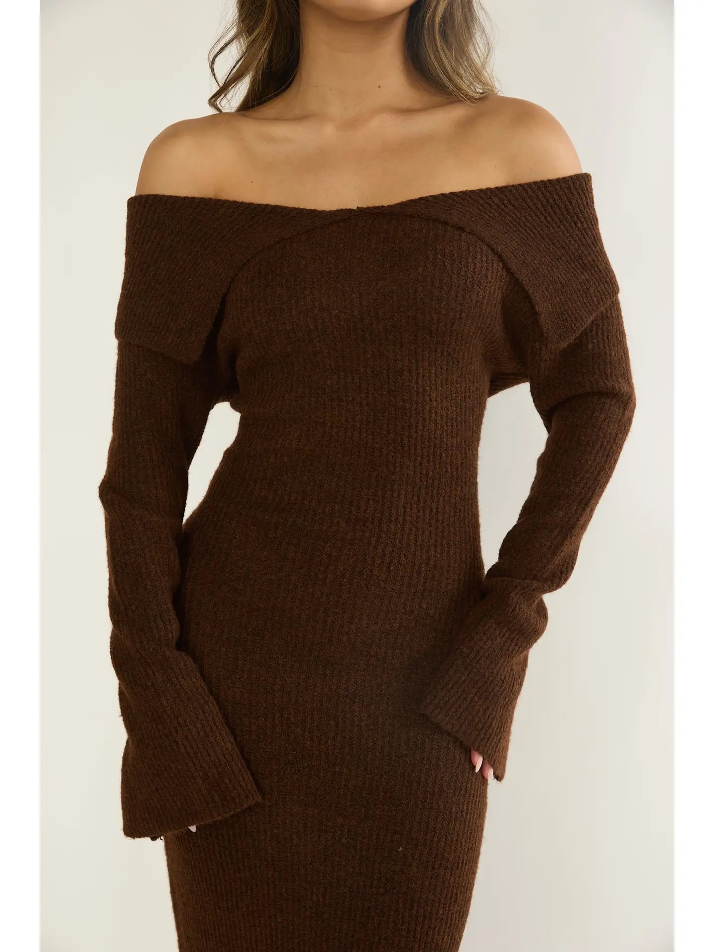 Slip into the Playing Tricks Maxi and let your silhouette do the talking. This floor-length stunner in rich chocolate brown features an off-the-shoulder neckline with a bold, structured overlay that gives classic elegance a modern edge. The ribbed knit fabric hugs your curves in all the right ways while adding visual texture and dimension. Perfect for turning heads at evening events or making a statement wherever sophistication meets a little playful attitude.