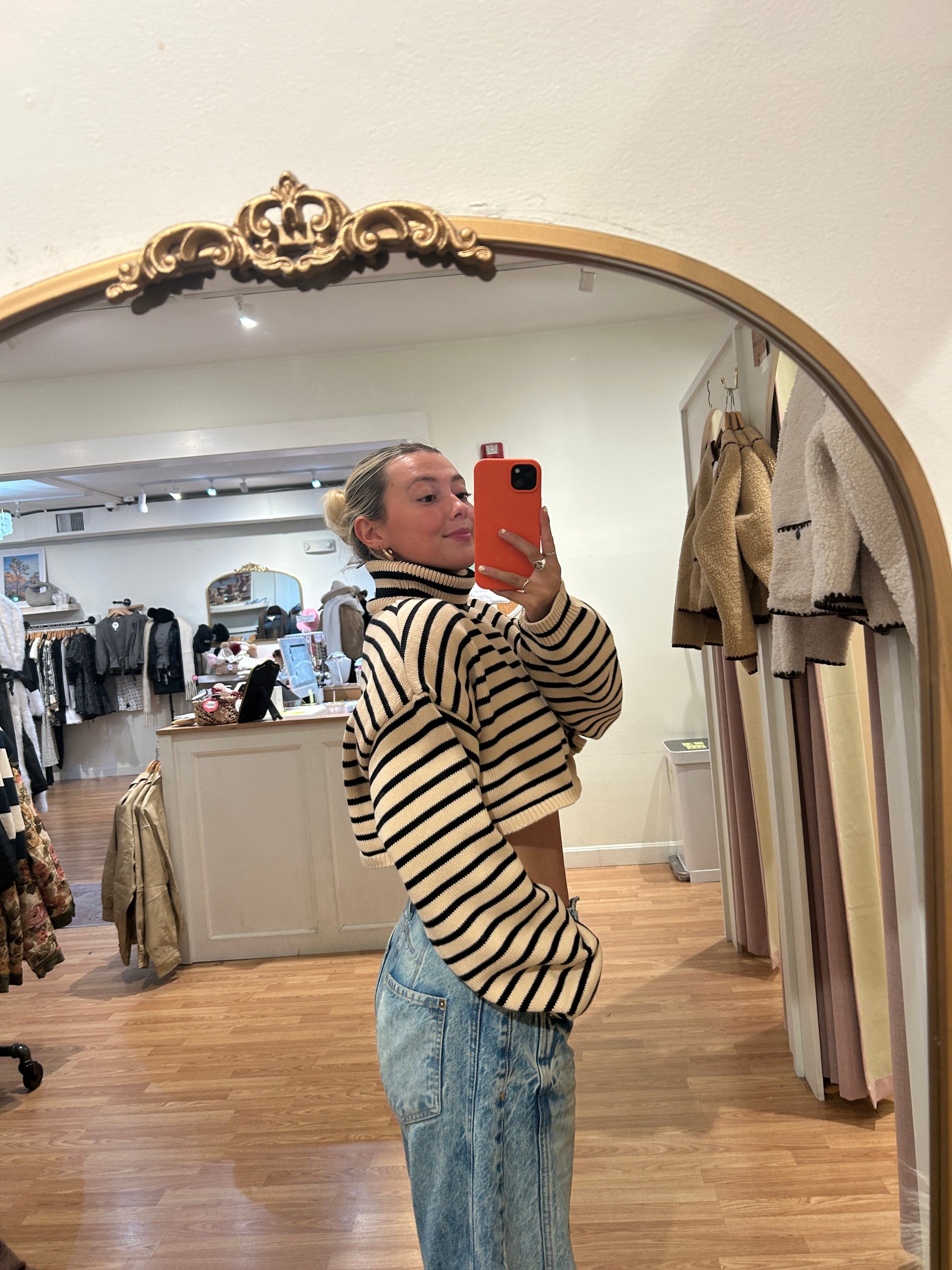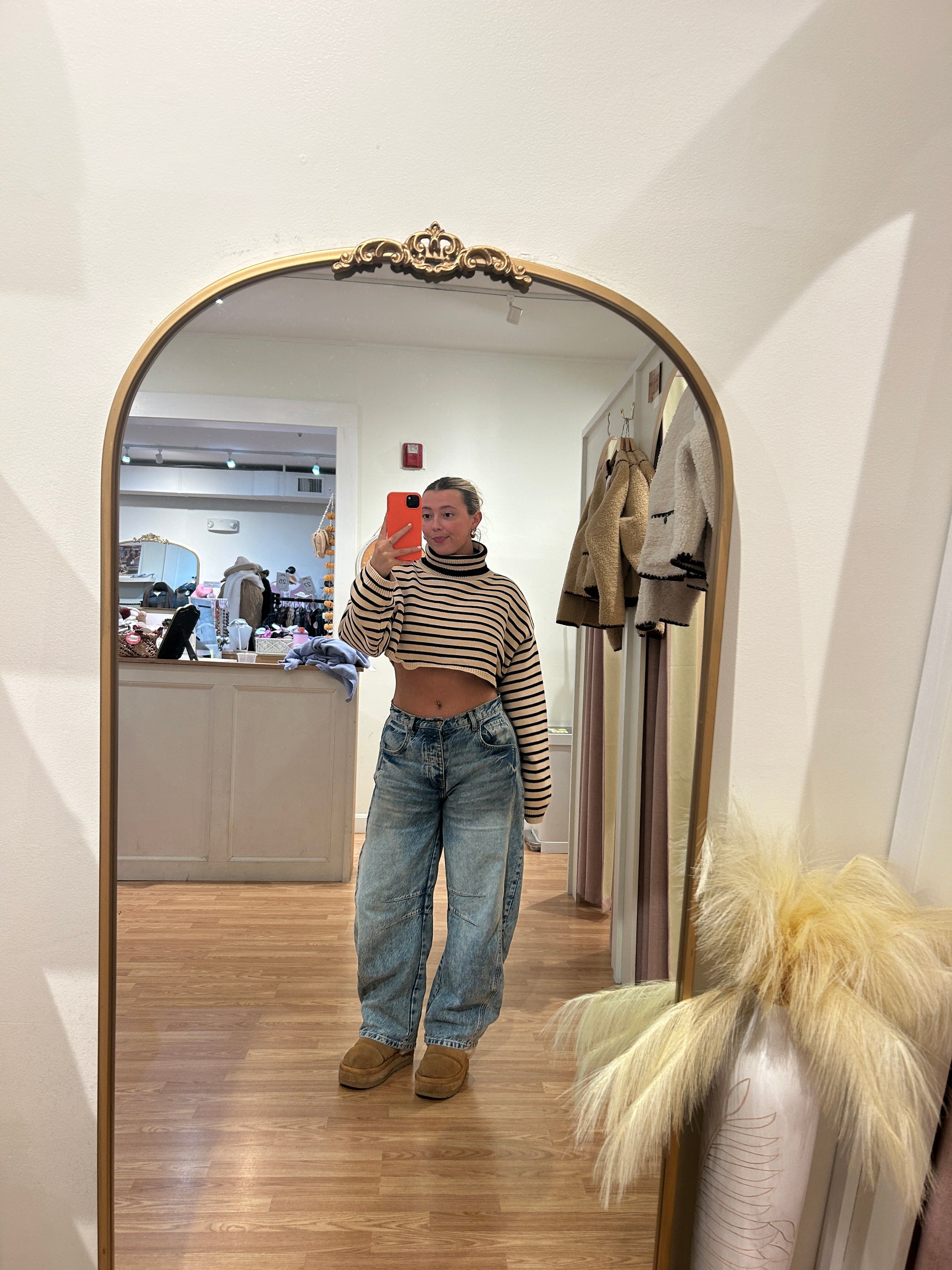 Meet your new favorite layering piece. The Rose Striped Sweater combines classic black and cream stripes with a cozy cropped turtleneck silhouette that's equal parts retro and modern. The soft knit fabric hugs in all the right places, while the shorter length shows off your style from every angle. Pair it with high-waisted jeans, midi skirts, or slip dresses for endless outfit possibilities. Timeless stripes, playful proportions—this sweater is ready for whatever your day throws at you.