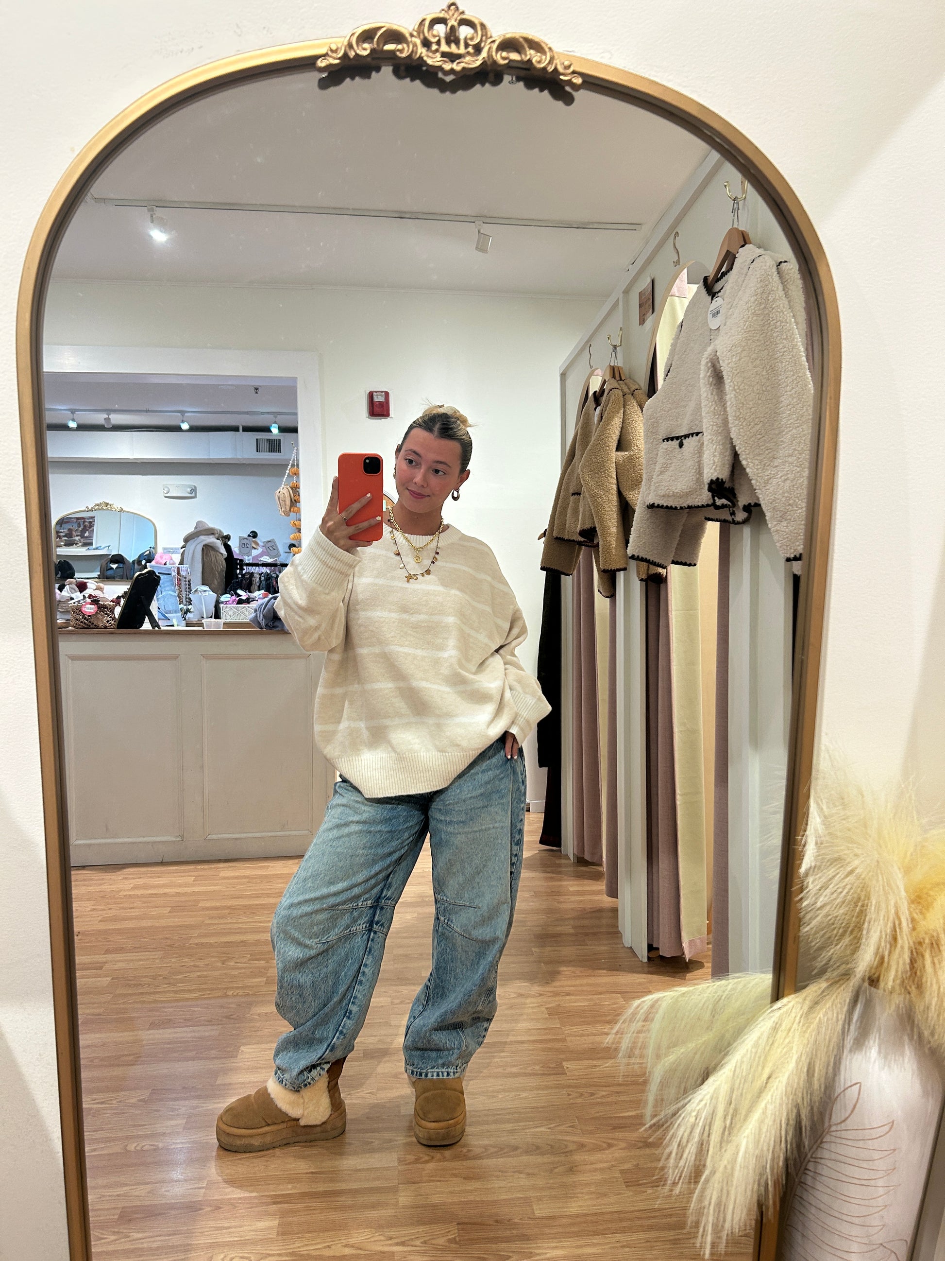 Wrap yourself in warmth with this cream and tan striped sweater that feels like a cozy hug. The soft, neutral palette makes it endlessly versatile—throw it on with anything and instantly elevate your look. Whether you're curling up with your favorite book or heading out for weekend adventures, this sweater delivers comfort without compromising on style. Your new go-to for those "I need something that just works" moments.