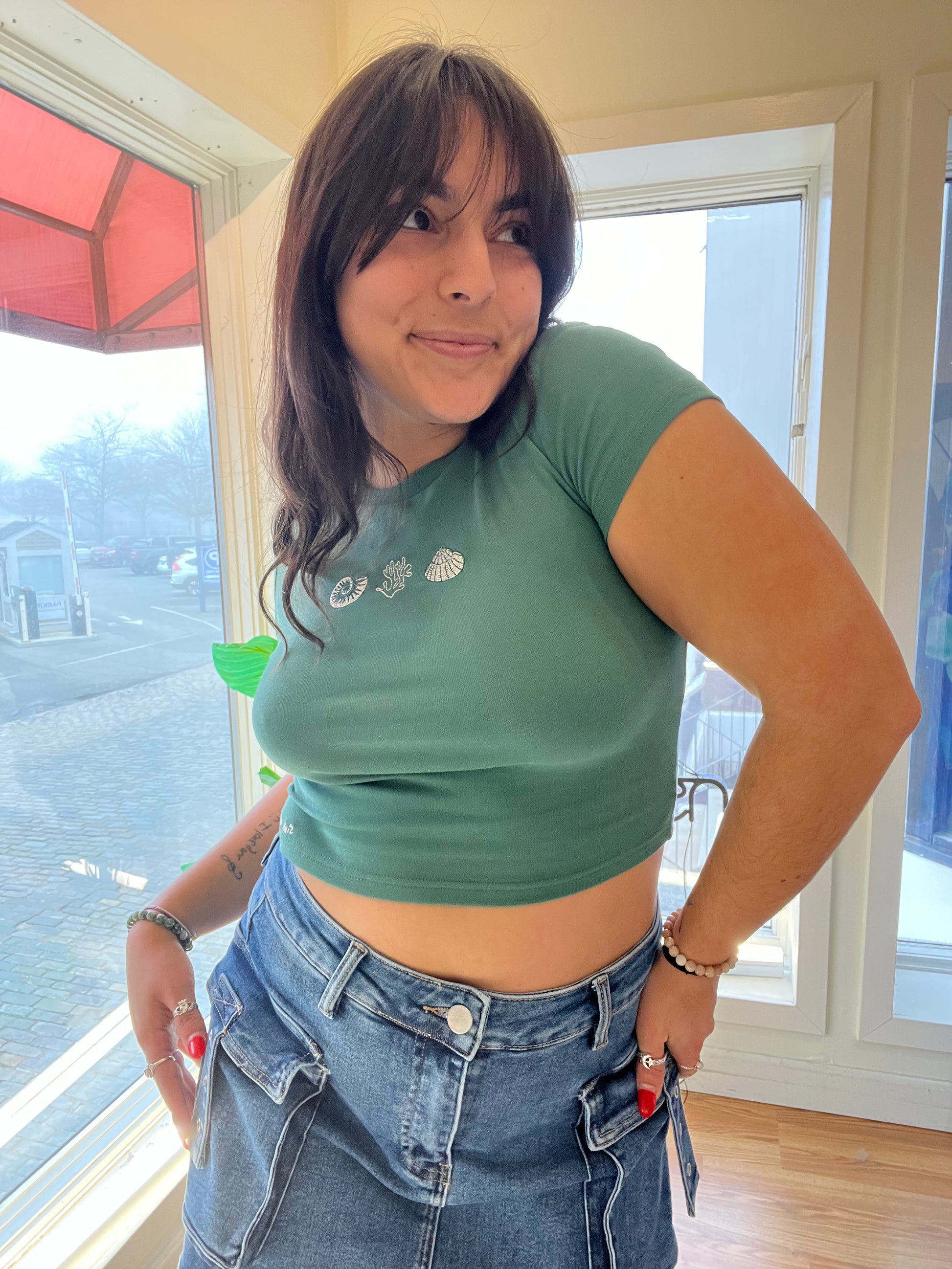 Add some whimsy to your wardrobe with our Seashell Baby Tee. Featuring embroidered seashells and a playful "sink or swim" phrase on the hem, this tee is perfect for beach days or simply adding a touch of fun to any outfit. Make a splash in style!