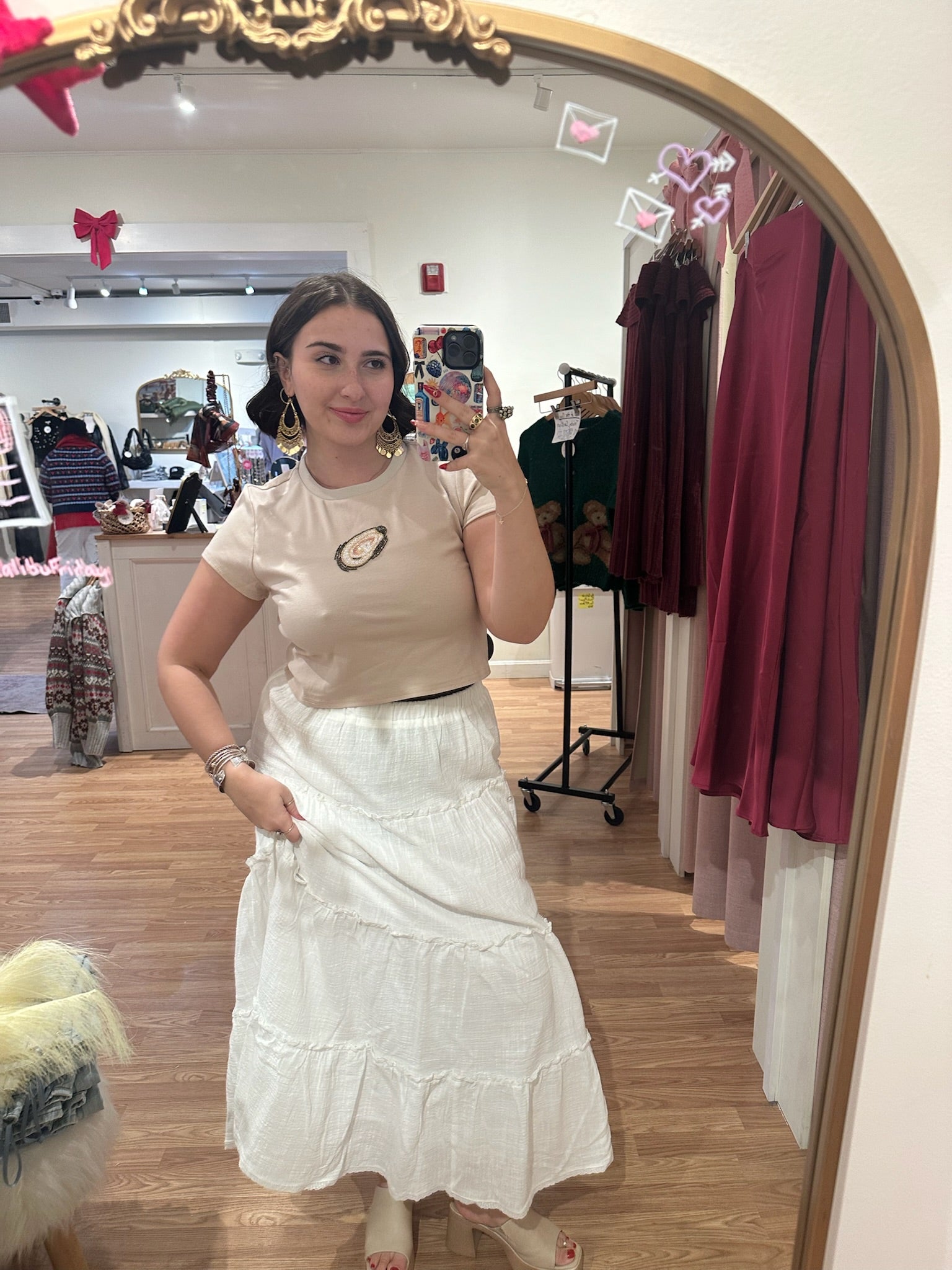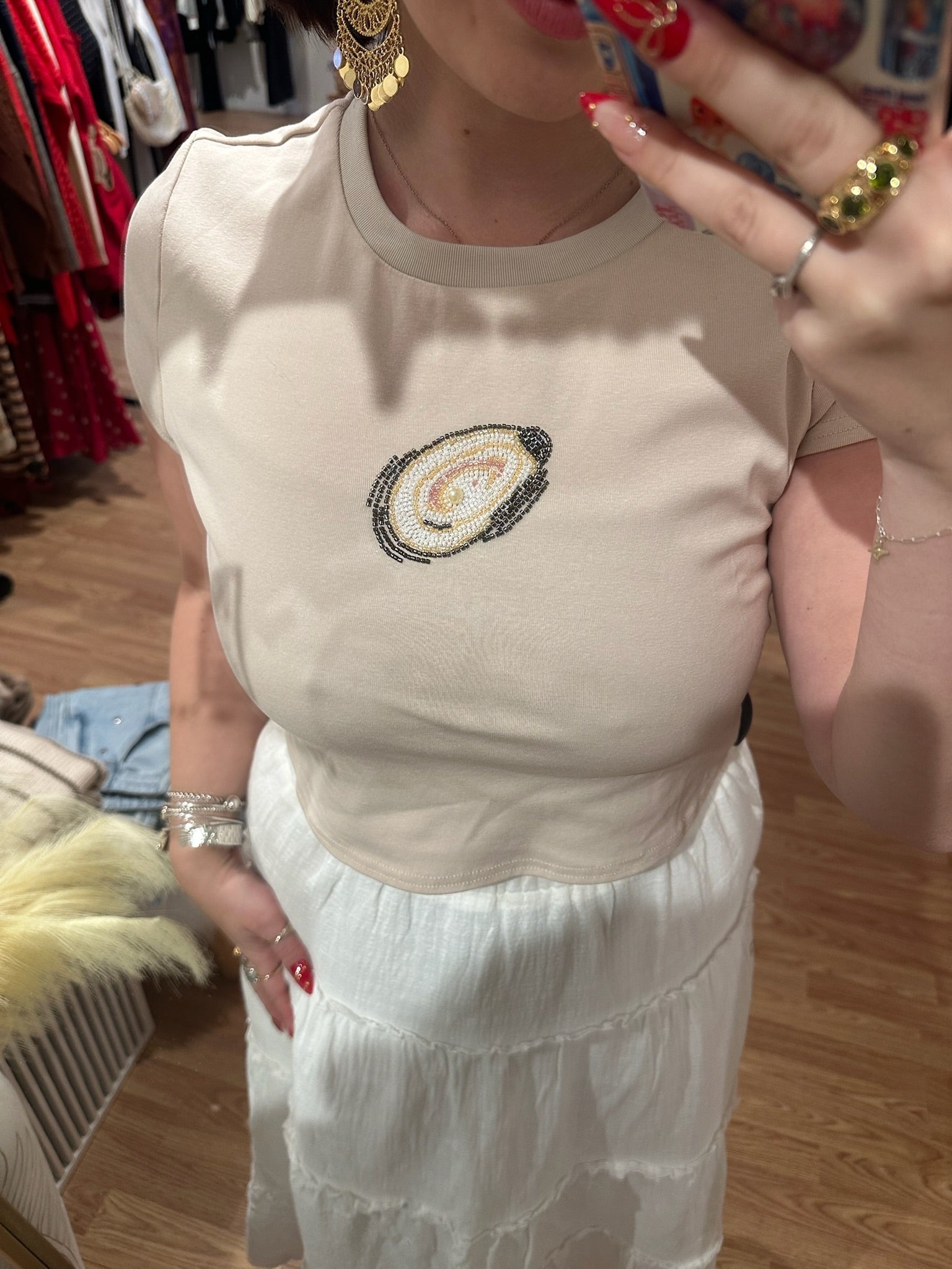 Dive into coastal vibes with this shimmering beaded oyster crop tee. Delicate shell-inspired beadwork catches the light with every move, bringing a touch of seaside sparkle to your everyday look. The cropped silhouette pairs perfectly with high-waisted bottoms for an effortlessly chic ensemble. Whether you're heading to the beach or bringing that breezy energy to the city, this playful piece celebrates the beauty of the ocean in style.