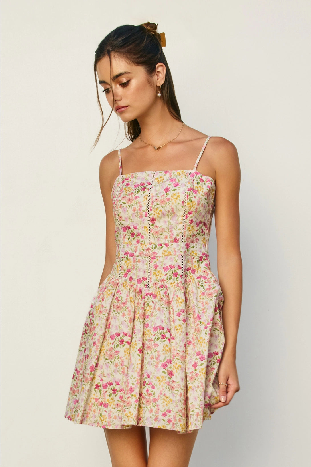 Shoot Your Shot in this flirty ditsy floral mini dress. Crafted from 100% cotton with a playful square neckline and delicate ladder lace trim inserts, it's designed to turn heads. Adjustable spaghetti straps, a dipped waist, and smocked back panel create a flattering silhouette, while the flared hem adds movement. Hidden back zipper and full lining keep you comfortable and confident all day long.
