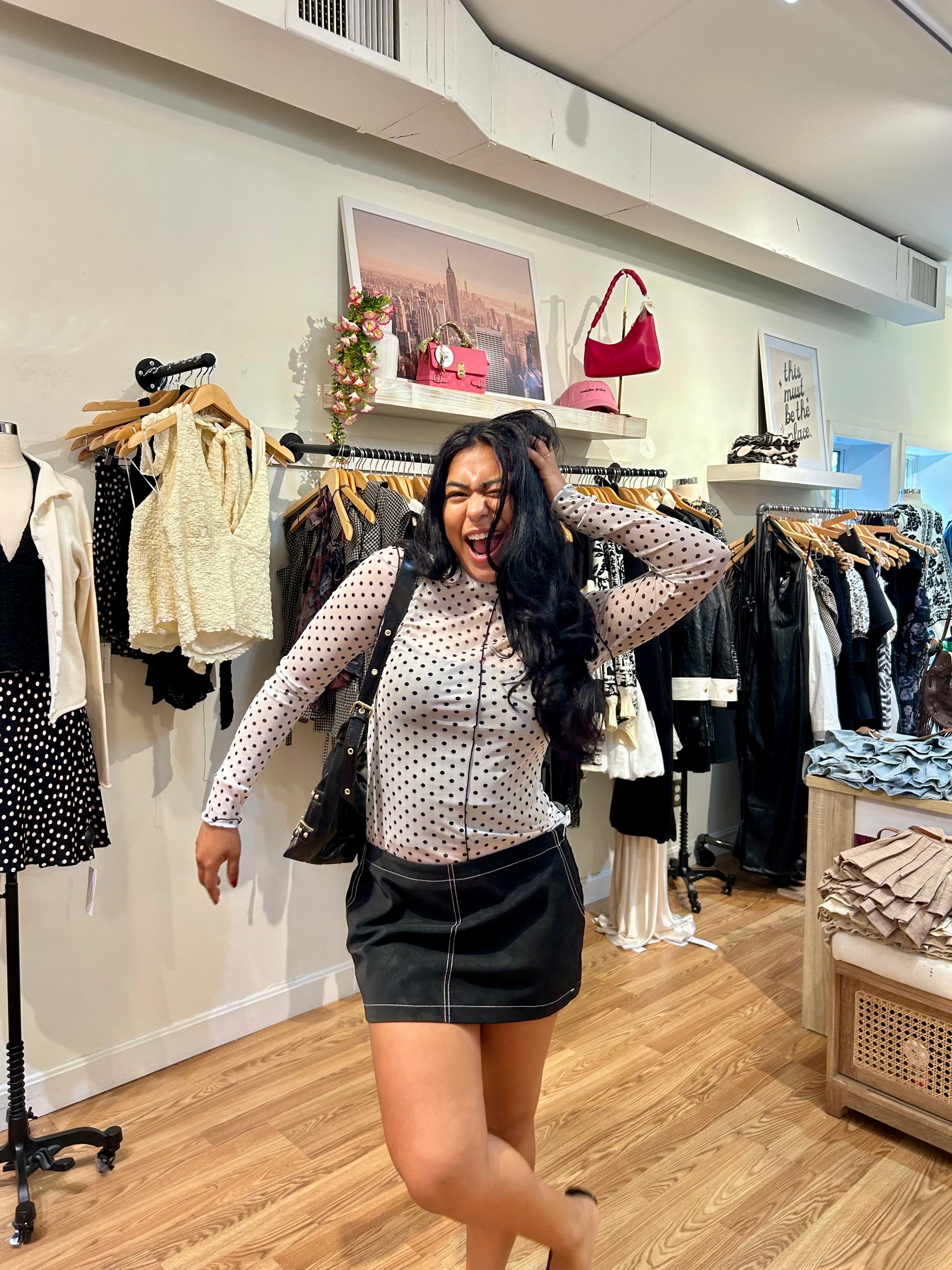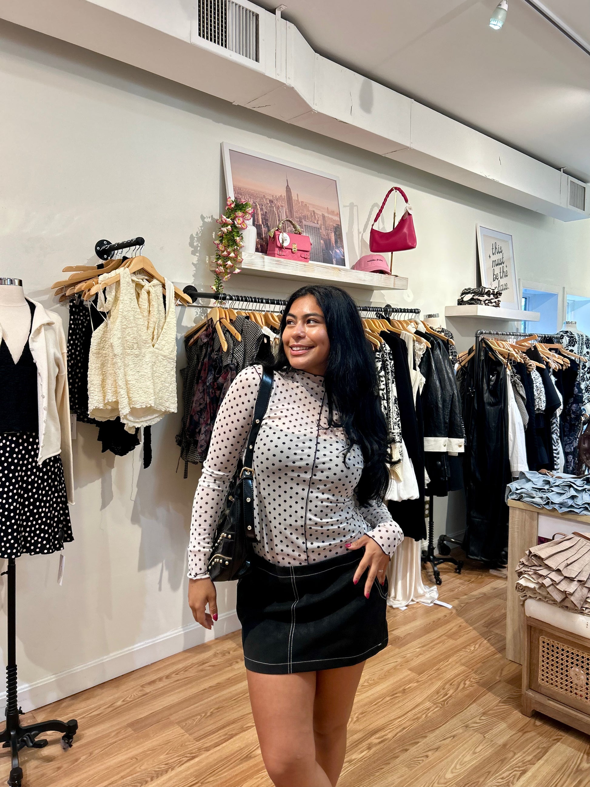 The Spotted Top is a playful long-sleeve piece that's perfect for layering. Its sheer fabric adds a touch of fun and style, making it ideal to wear over your favorite camisole or tank top. Light and breezy, this top brings a sweet and effortless vibe to any outfit.