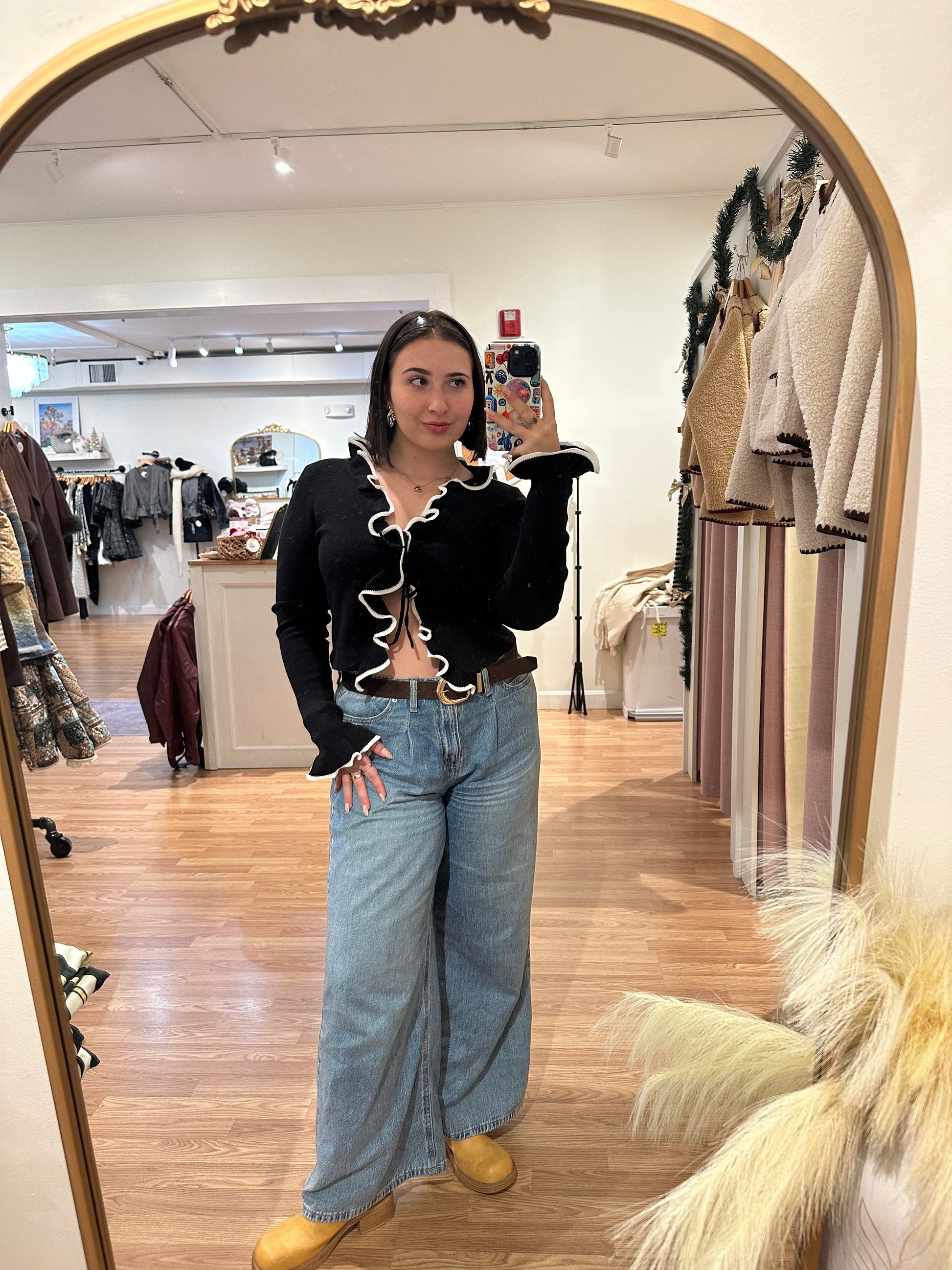 Elevate your everyday style with this chic black cardigan, where a striking white wavy neckline adds an unexpected twist. The playful contrast creates visual interest while the classic silhouette keeps things timeless. Perfect for layering over your favorite tee or dress, this piece transitions seamlessly from casual coffee runs to weekend hangouts. The wavy detail brings just enough personality to make a statement without trying too hard.