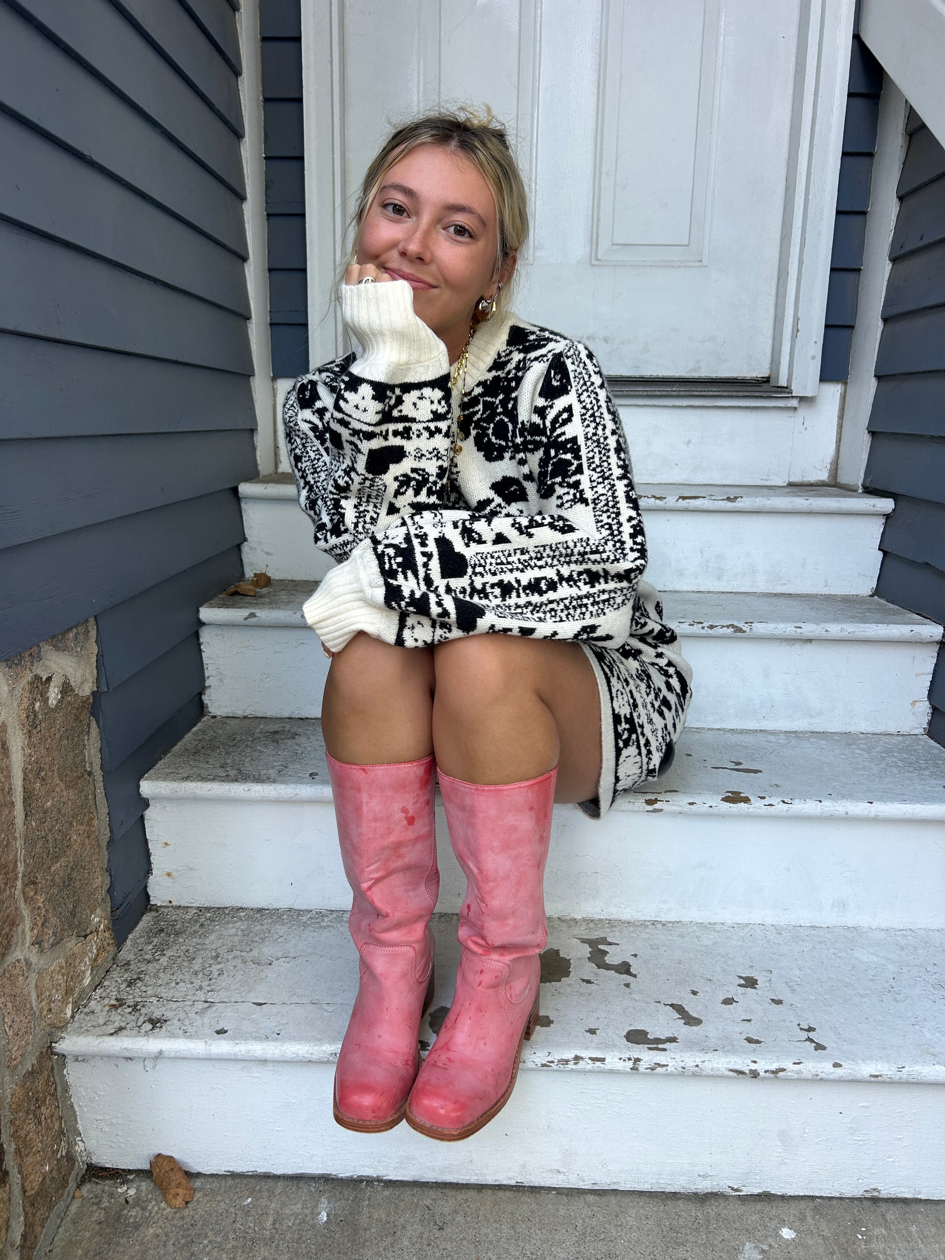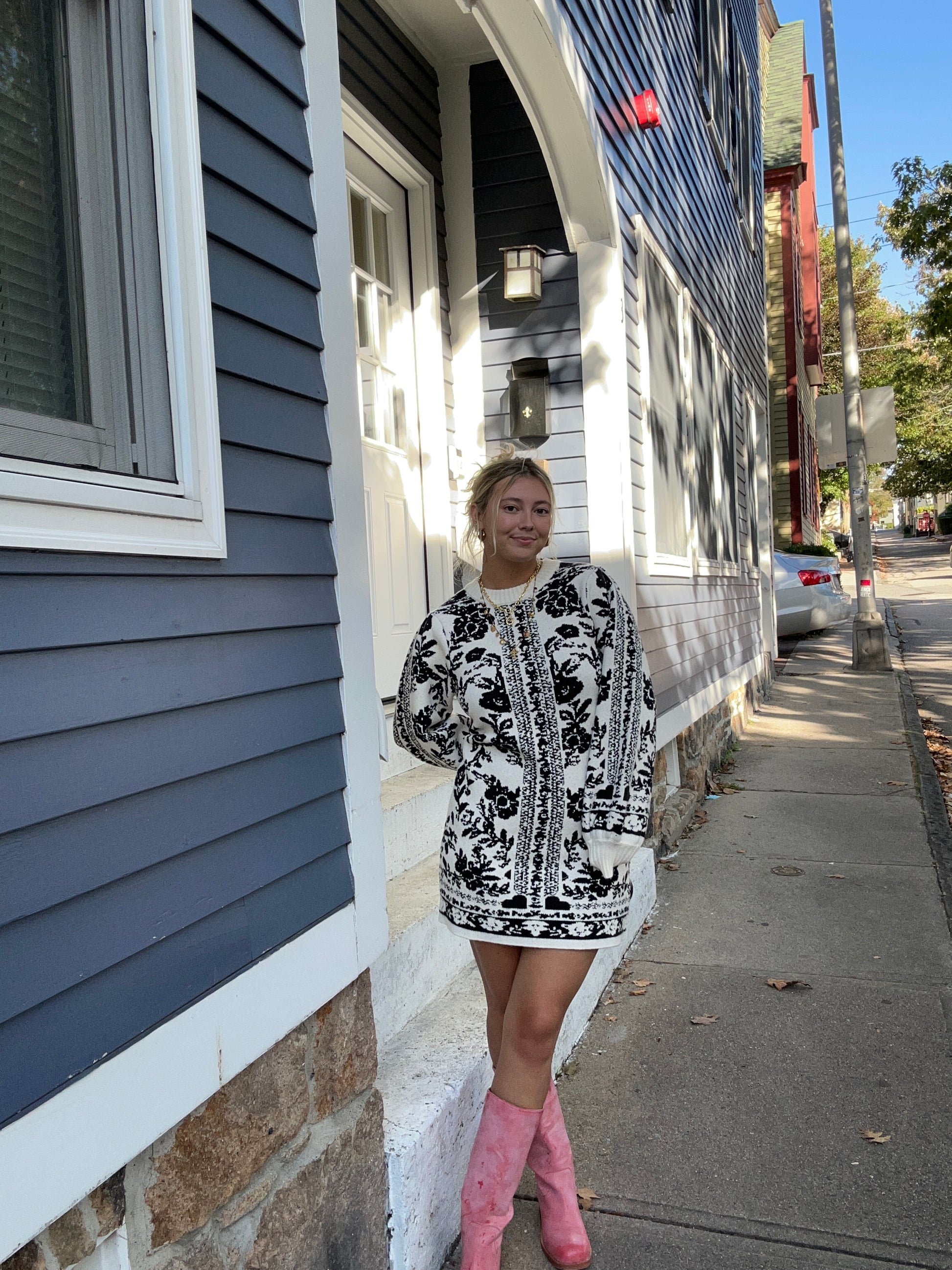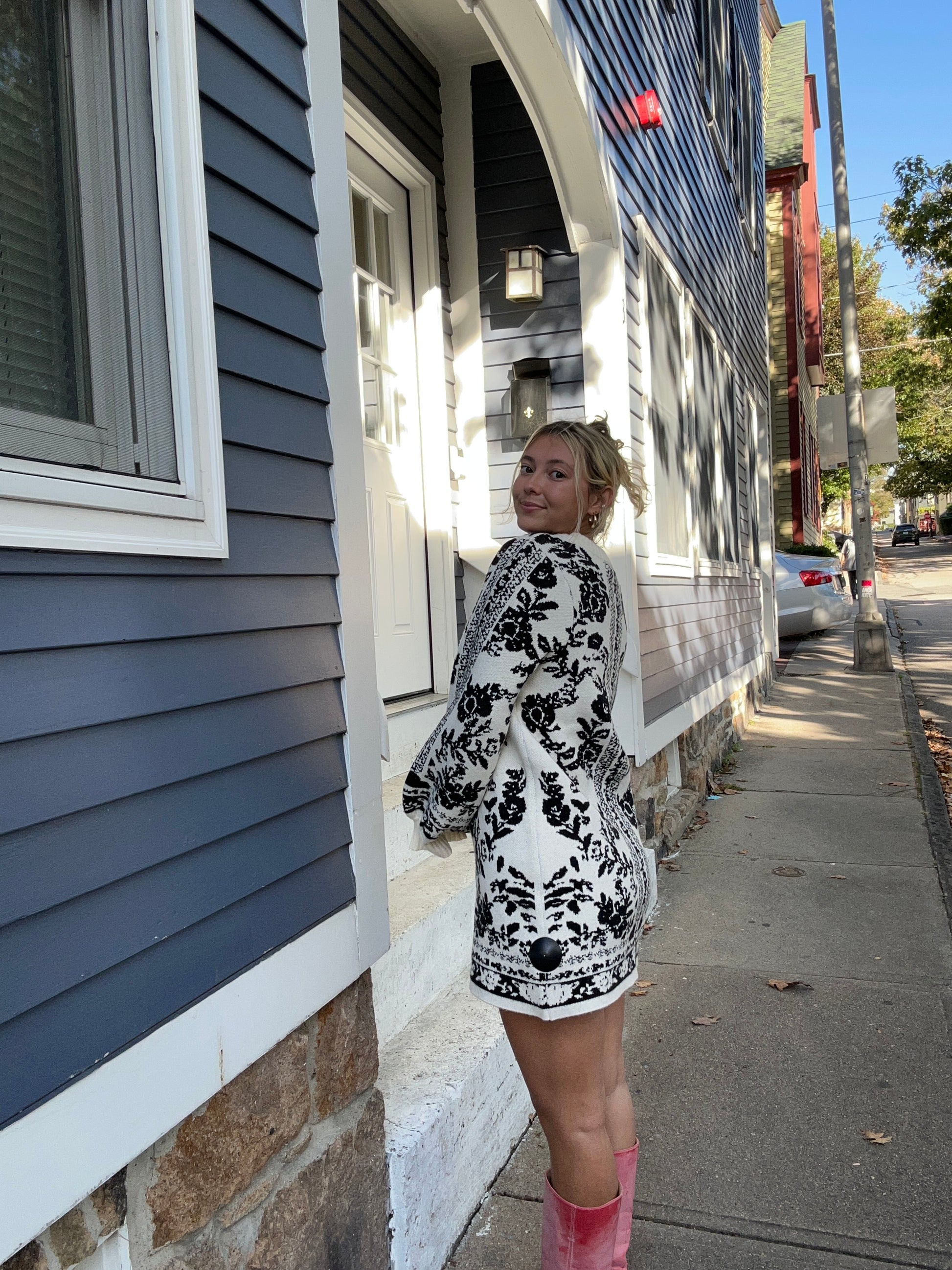 Cozy meets chic in this oversized cream sweater mini dress, adorned with a playful black paisley floral print. The Way Out Mini Dress combines comfort with bold style, perfect for turning heads while staying snug. Its roomy fit lets you move freely, making it ideal for casual days or laid-back nights out. Embrace a fun, effortless look thatโs ready to take you anywhere and if you want to give it some shape, just add a black belt!