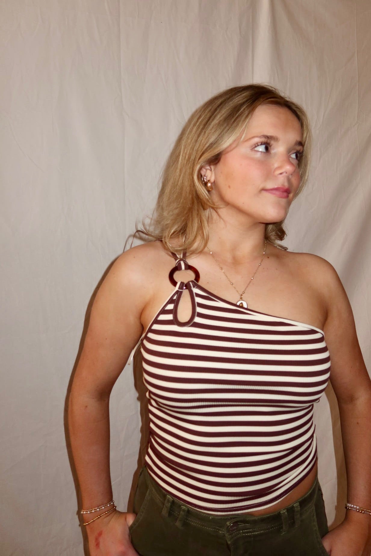 Striped cami meets modern edge with this one-shoulder wonder. Adjustable strap lets you dial in the perfect fit, while a statement ring detail keeps things undeniably cool. Soft, stretchy fabric moves with you all day—whether you're heading to brunch or a night out. This top won't be forgotten.